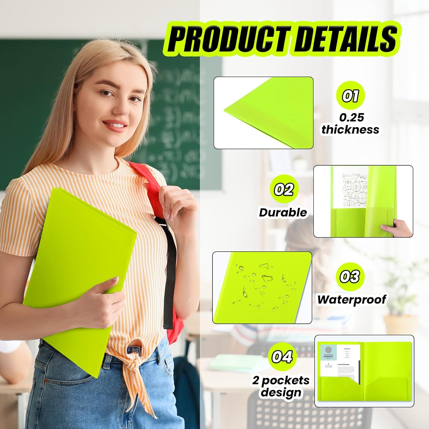 Gueevin 72 Pcs Two Pocket Folders Bulk Plastic File Folder with 2 Pockets Letter Size Paper Heavy Duty Durable Portfolios Case for Home Office School Business 11.61 x 9.45 Inch (Fluorescent Green)