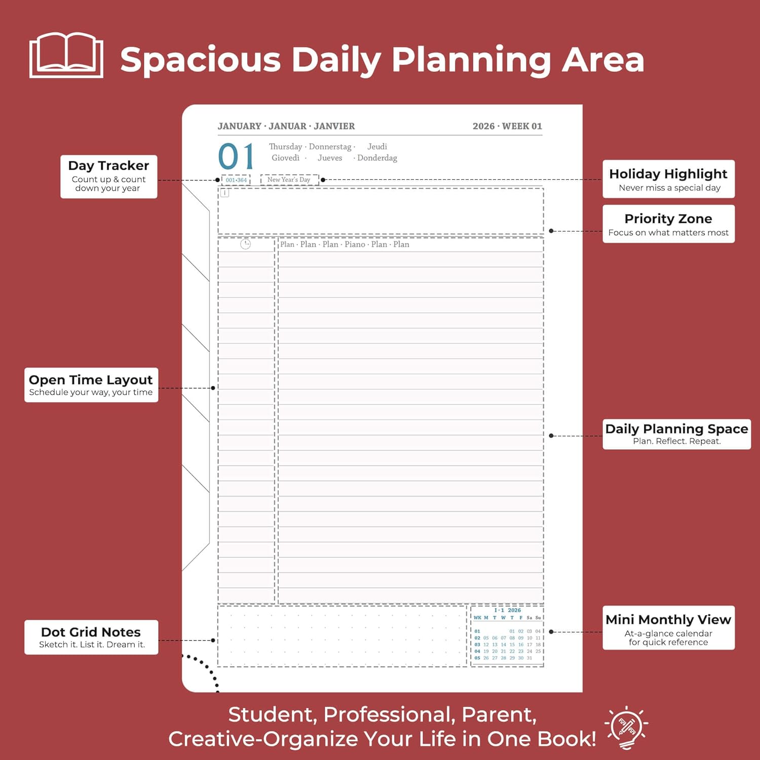 - Universal Design Daily planner 2026 full page per day: Suitable for a variety of people and scenarios. Professionals manage project progress, meeting arrangements and goals; student planner 2026 courses, exams and extracurricular activities; home users arrange travel, activitie