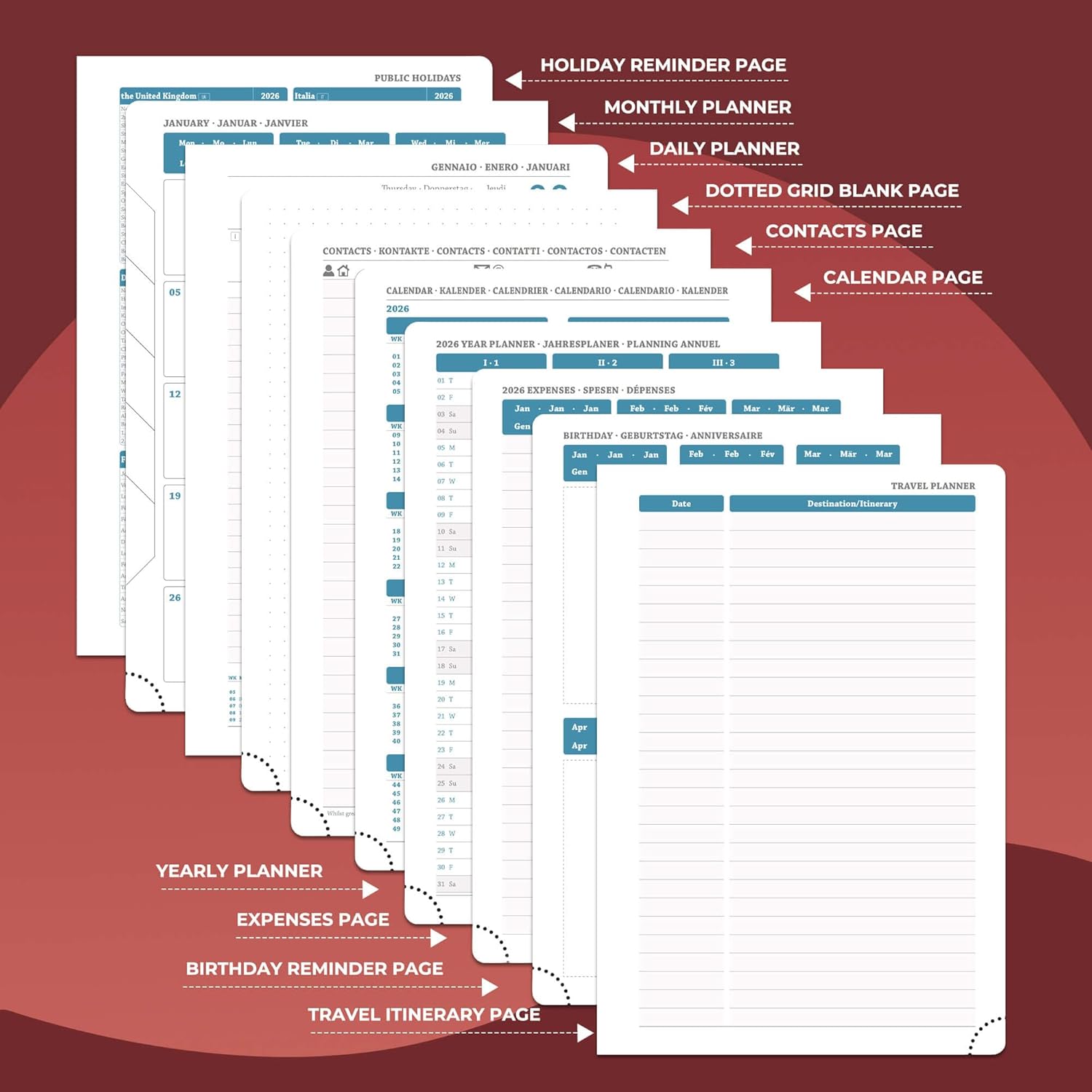- Multi function Page: Personalized Daily planner system.Monthly pages, holiday reminders, birthday record area for relatives and friends; set up storage contacts, and record inspiration and plans with the dot matrix note area; at the same time, The lined pages allows you to write your annual summary,work planner can travel planning and expense management modules to achieve coordination of schedule and finance