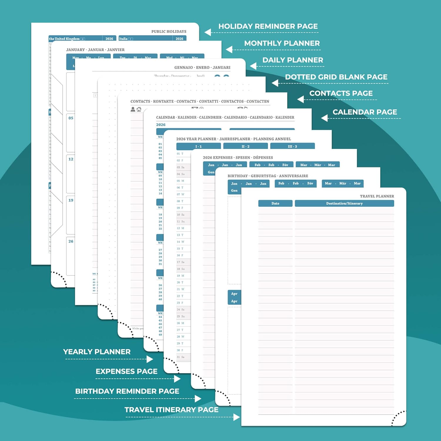 - Multi function Page: Personalized Daily planner system.Monthly pages, holiday reminders, birthday record area for relatives and friends; set up storage contacts, and record inspiration and plans with the dot matrix note area; at the same time, The lined pages allows you to write your annual summary,work planner can travel planning and expense management modules to achieve coordination of schedule and finance