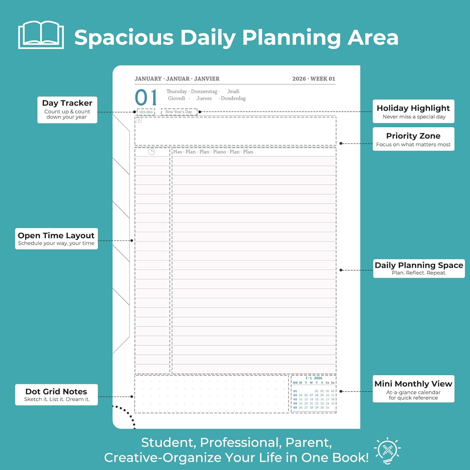 - Universal Design Daily planner 2026 full page per day: Suitable for a variety of people and scenarios. Professionals manage project progress, meeting arrangements and goals; student planner 2026 courses, exams and extracurricular activities; home users arrange travel, activitie