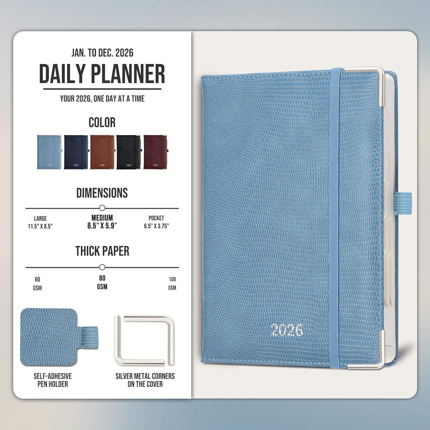 Daily Planner 2026 with One Page Per Day,(A5-8.5" x 5.9"),12 Months Calendar Hourly Appointment Book Monthly Tabs & Self-adhesive Pen Holder,Inner Pocket,Durable Vegan Leather,Sky Blue