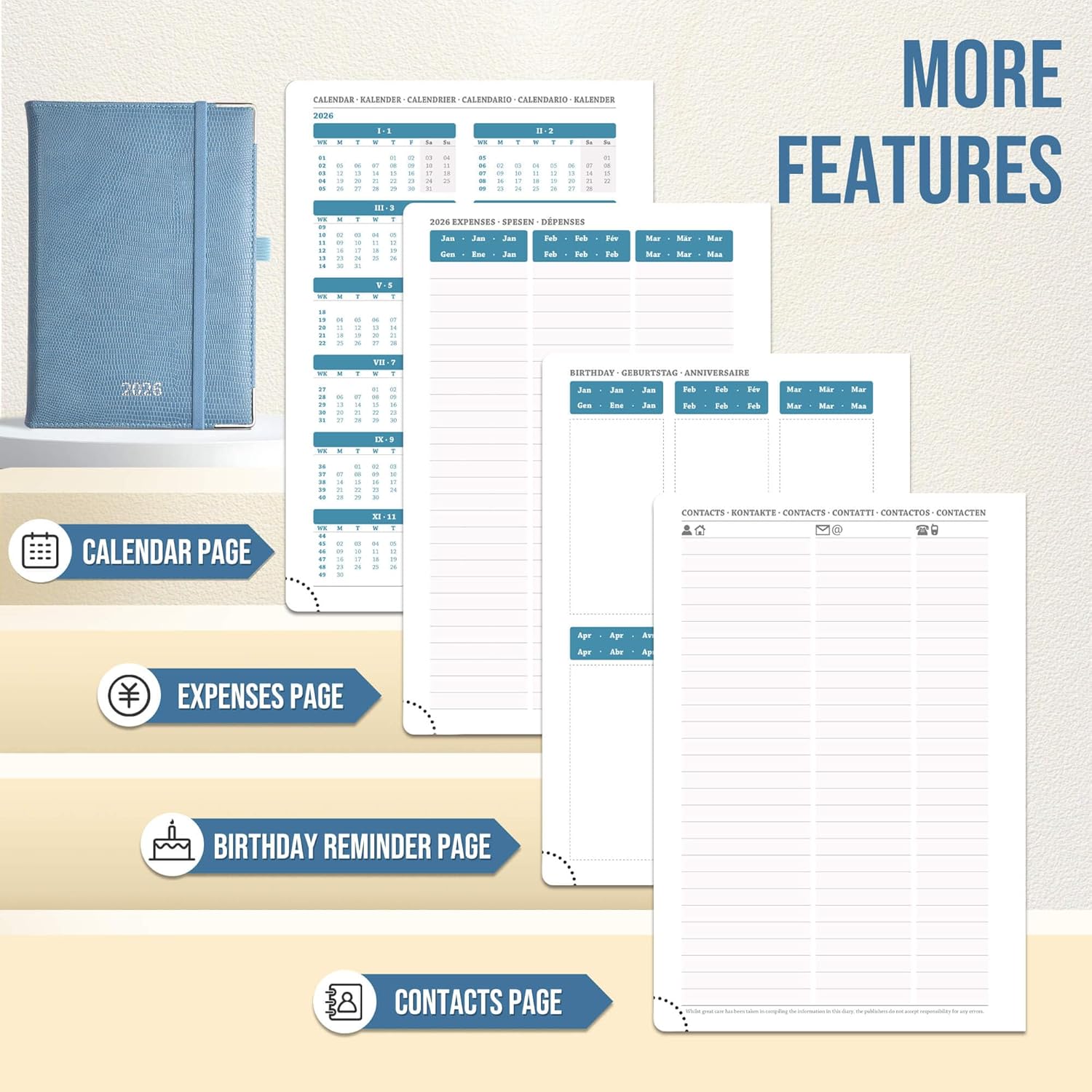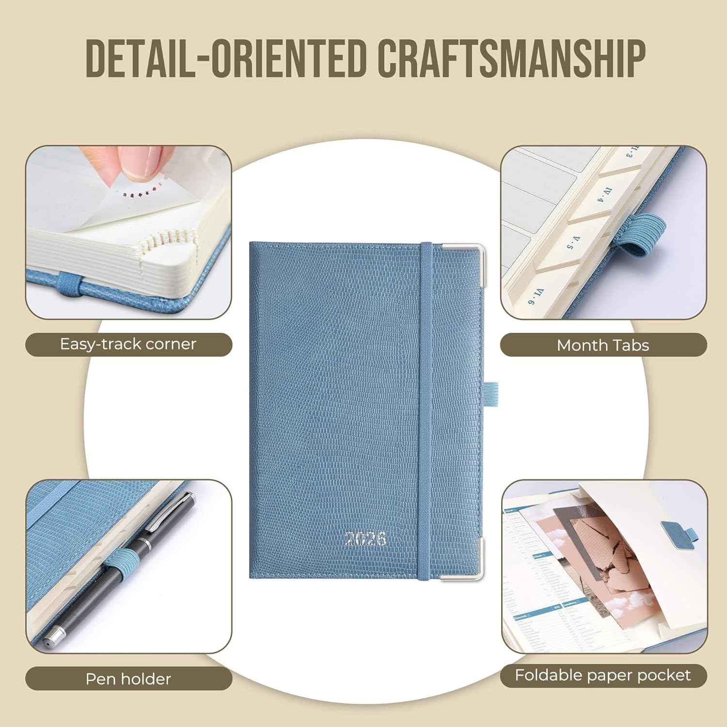 - Thoughtful Design: The monthly tabs on the side of the daily planner can easy locate the current date; The easy-track corner design and ribbon marker make it easy to flip through the small planner. The last page of the 2026 planner daily has an expanded inner pocket that has a small space for storage of cards
