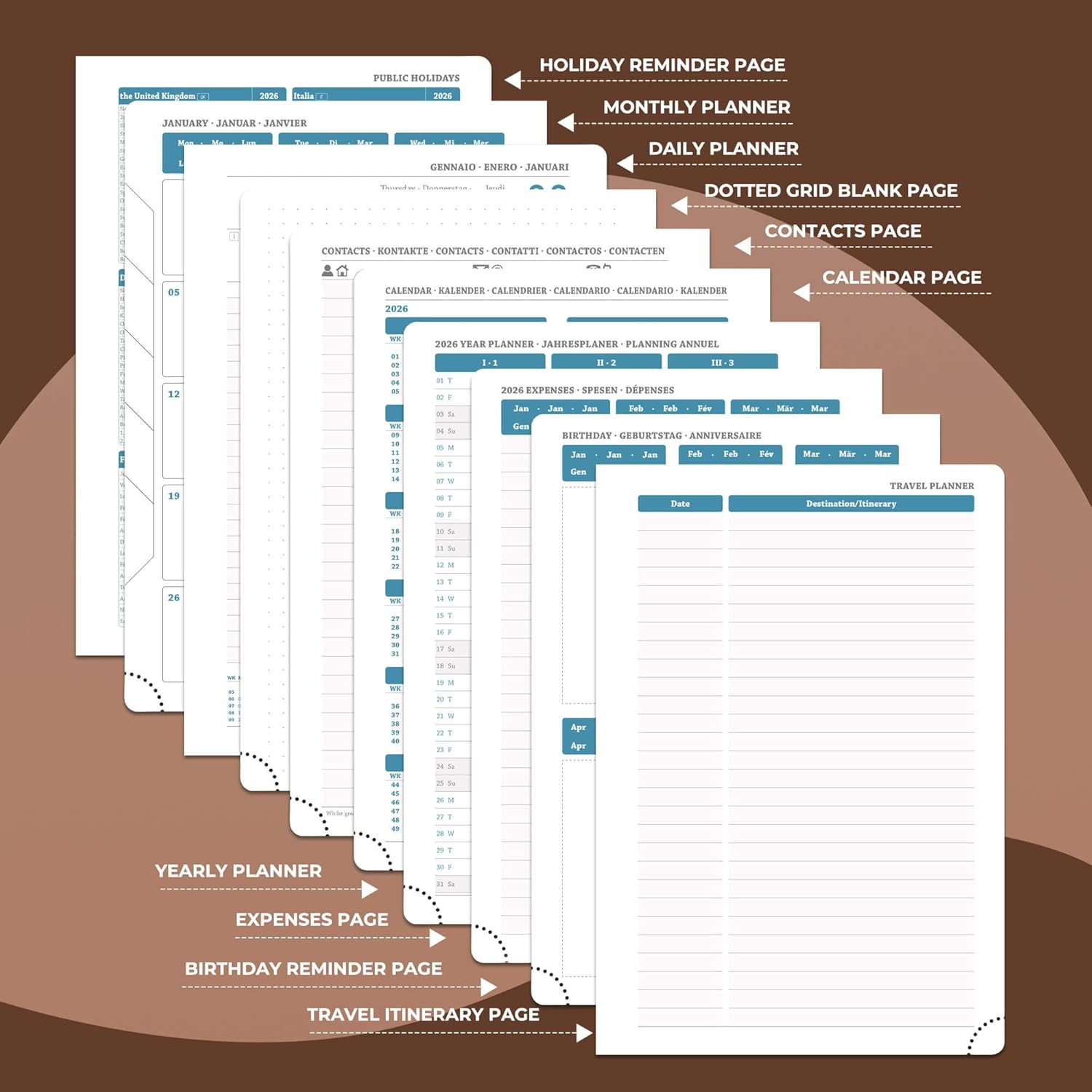 - Multi function Page: Personalized Daily planner system.Monthly pages, holiday reminders, birthday record area for relatives and friends; set up storage contacts, and record inspiration and plans with the dot matrix note area; at the same time, The lined pages allows you to write your annual summary,work planner can travel planning and expense management modules to achieve coordination of schedule and finance