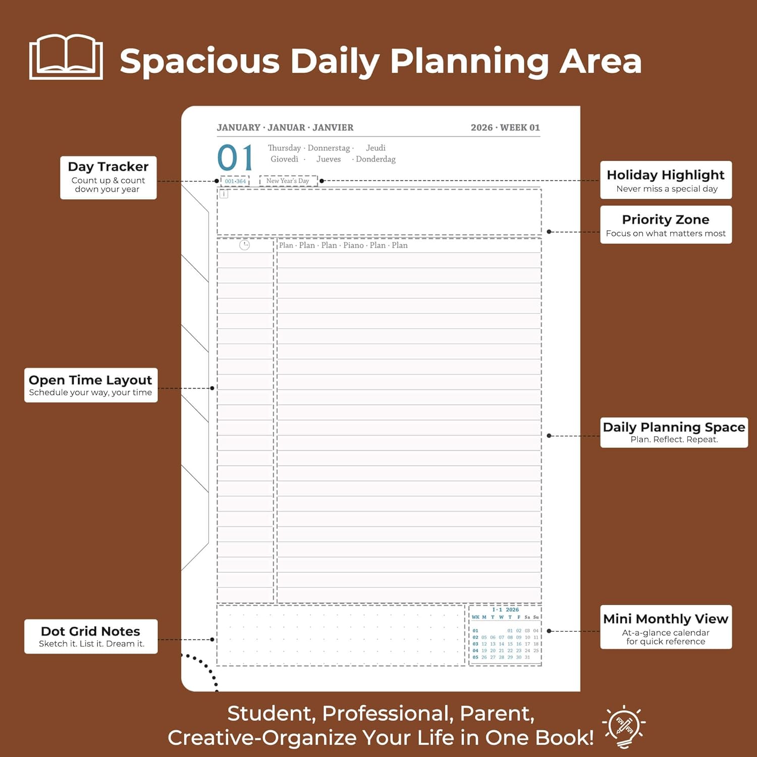 - Universal Design Daily planner 2026 full page per day: Suitable for a variety of people and scenarios. Professionals manage project progress, meeting arrangements and goals; student planner 2026 courses, exams and extracurricular activities; home users arrange travel, activitie
