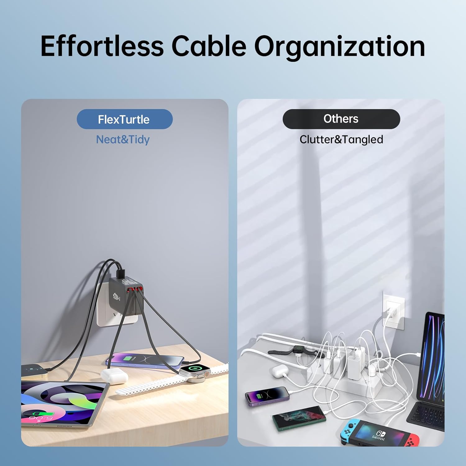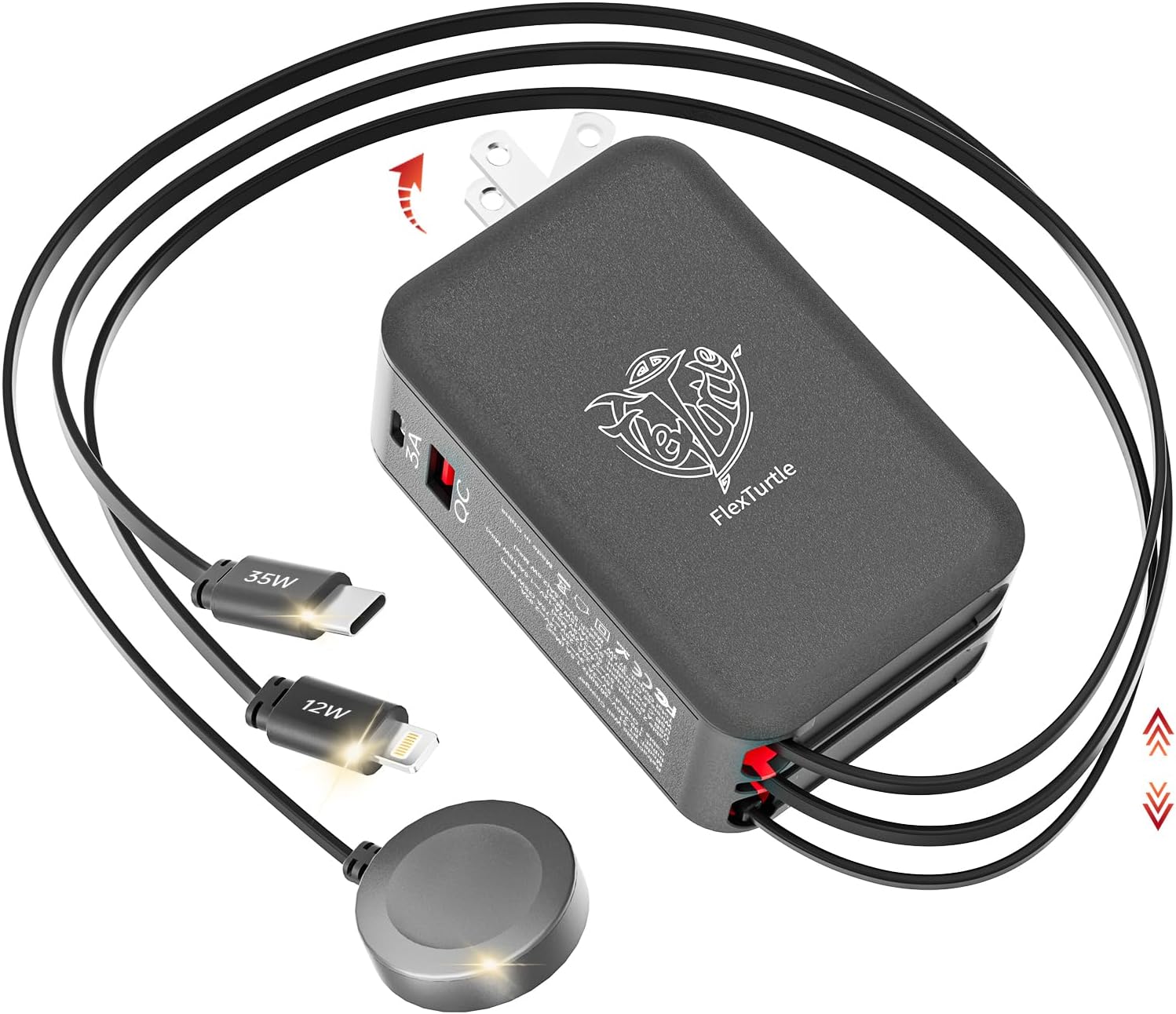 - ăSpace-Saving Retractable Design ă-The FlexTurtle retractable phone charger wall plug features three 3.2ft retractable cables (USB-C, Lightning, and Apple Watch), eliminating clutter. Perfect as a phone charging station for desks, nightstands, or as travel accessories for women and men