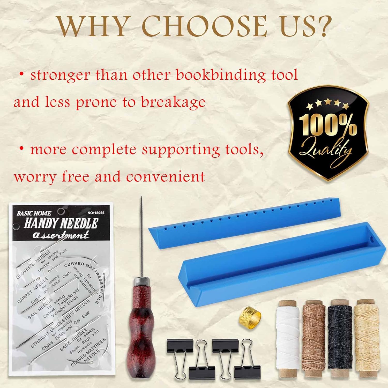 - 【WHAT THE PACKAGE INCLUDES】Our bookbinding kit includes 1 x book binding punch guide, 1 x wood handle awl, 7 bookbinding needles, 4 x 100ft waxed thread, 4 x black blinder paper clips, 1 x thimble ring.