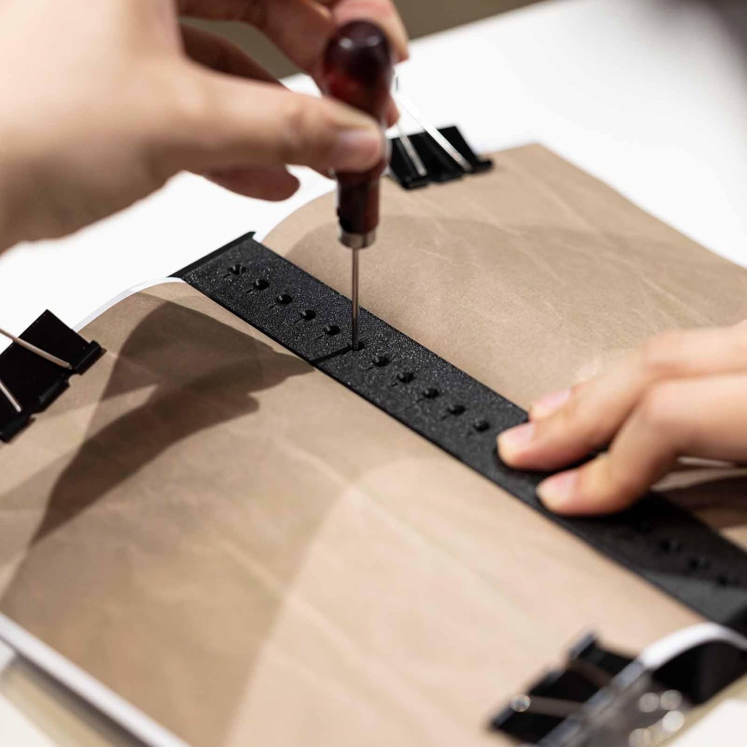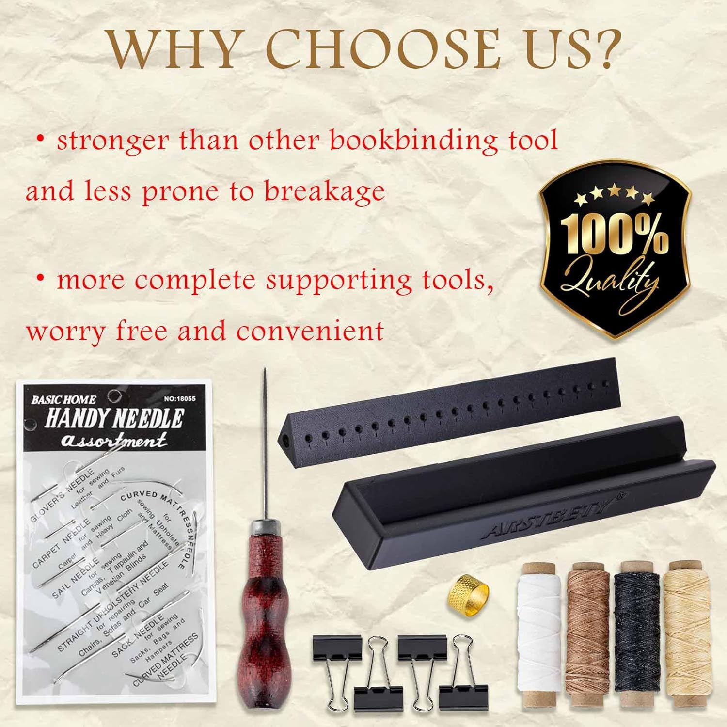 - 【WHAT THE PACKAGE INCLUDES】Our bookbinding kit includes 1 x book binding punch guide, 1 x wood handle awl, 7 bookbinding needles, 4 x 100ft waxed thread, 4 x black blinder paper clips, 1 x thimble ring.