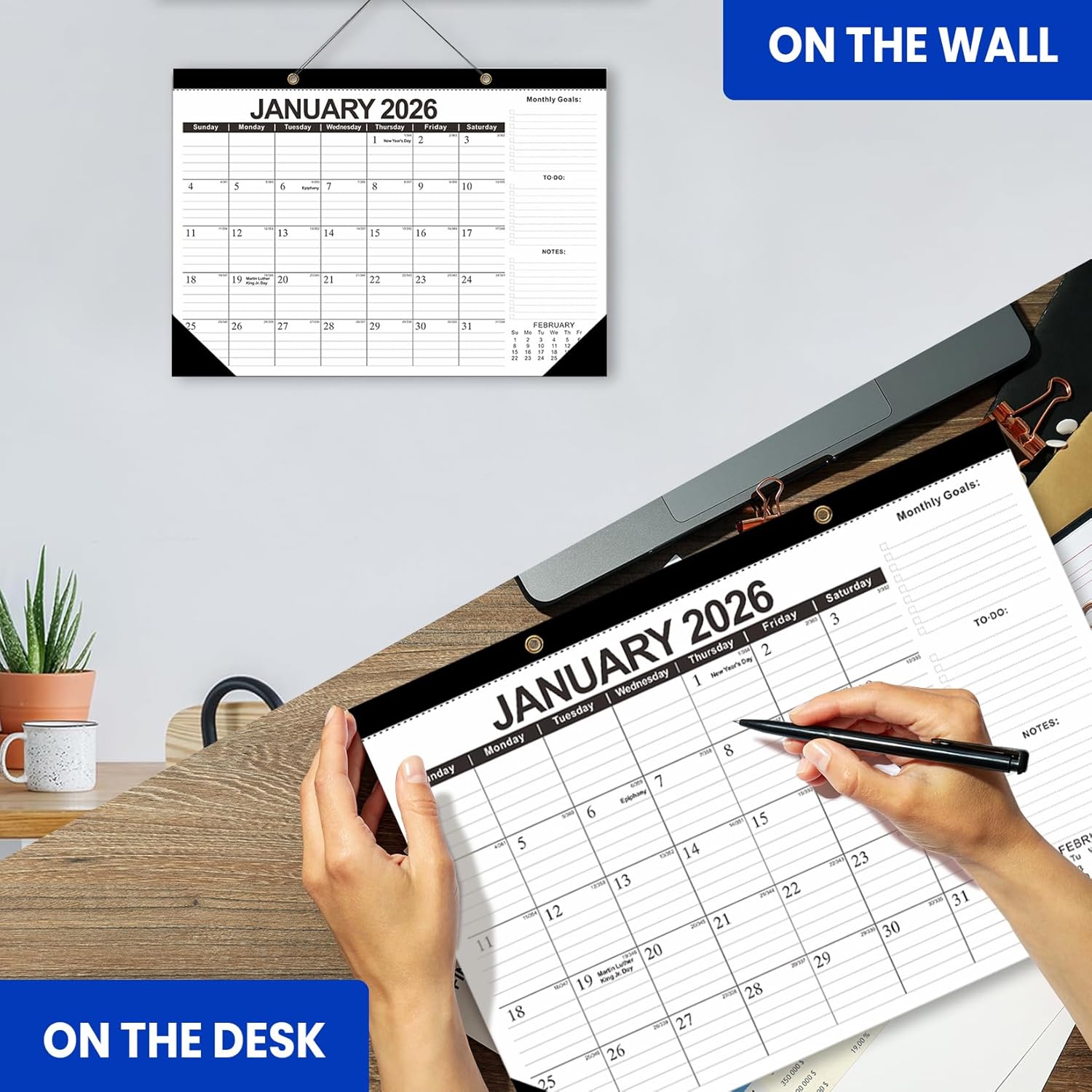 - 【Durable and Multi-Functional】Featuring a waterproof cover and reinforced corners to protect pages, this calendar includes hanging holes for both wall and desk use.