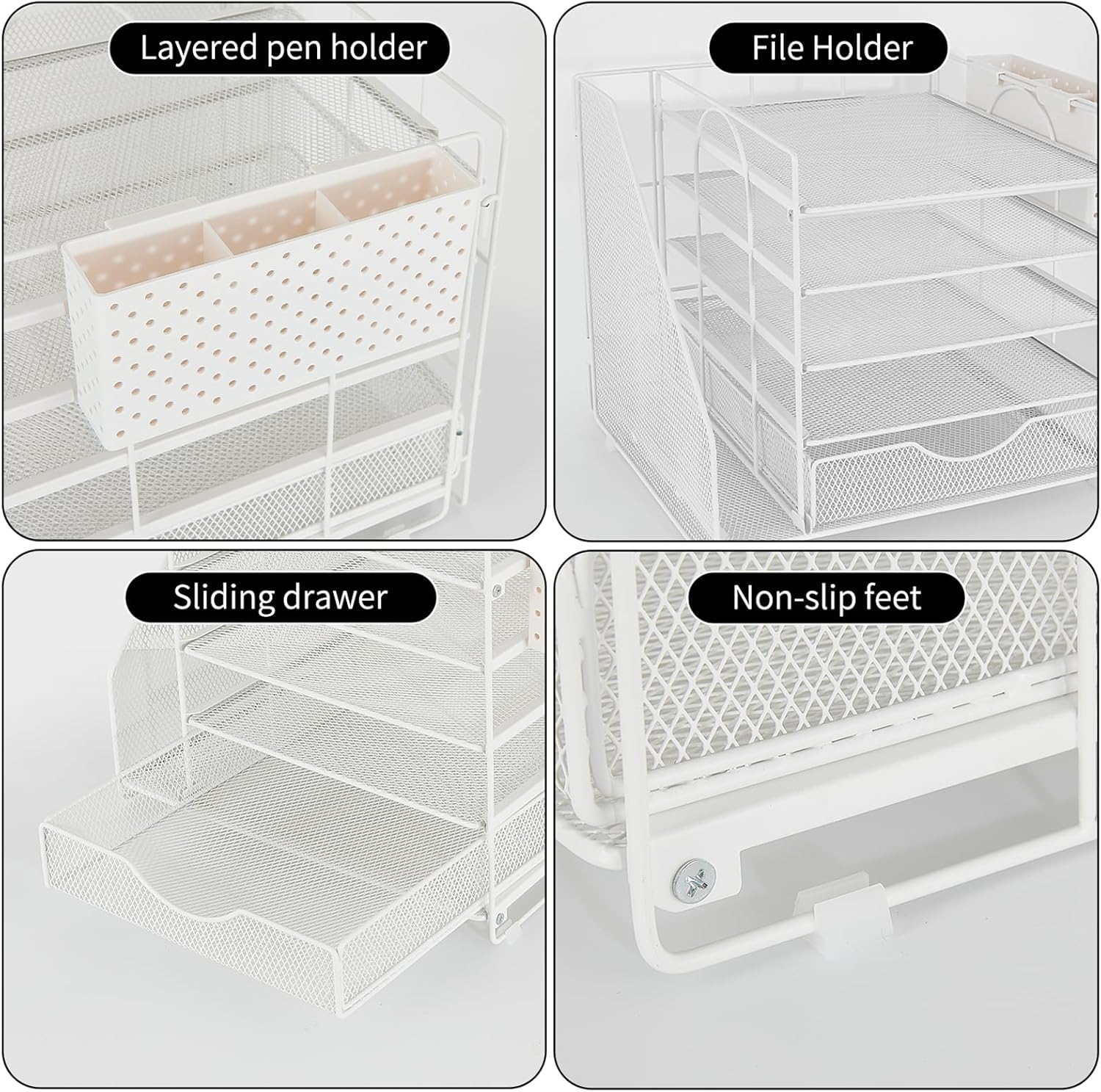 Desk Organizer with Drawer and Pen Holder, 5-Tier Paper Letter Tray Organizer with File Holder, Suitable for Workspace Organizer Office Supplies Storage (White)