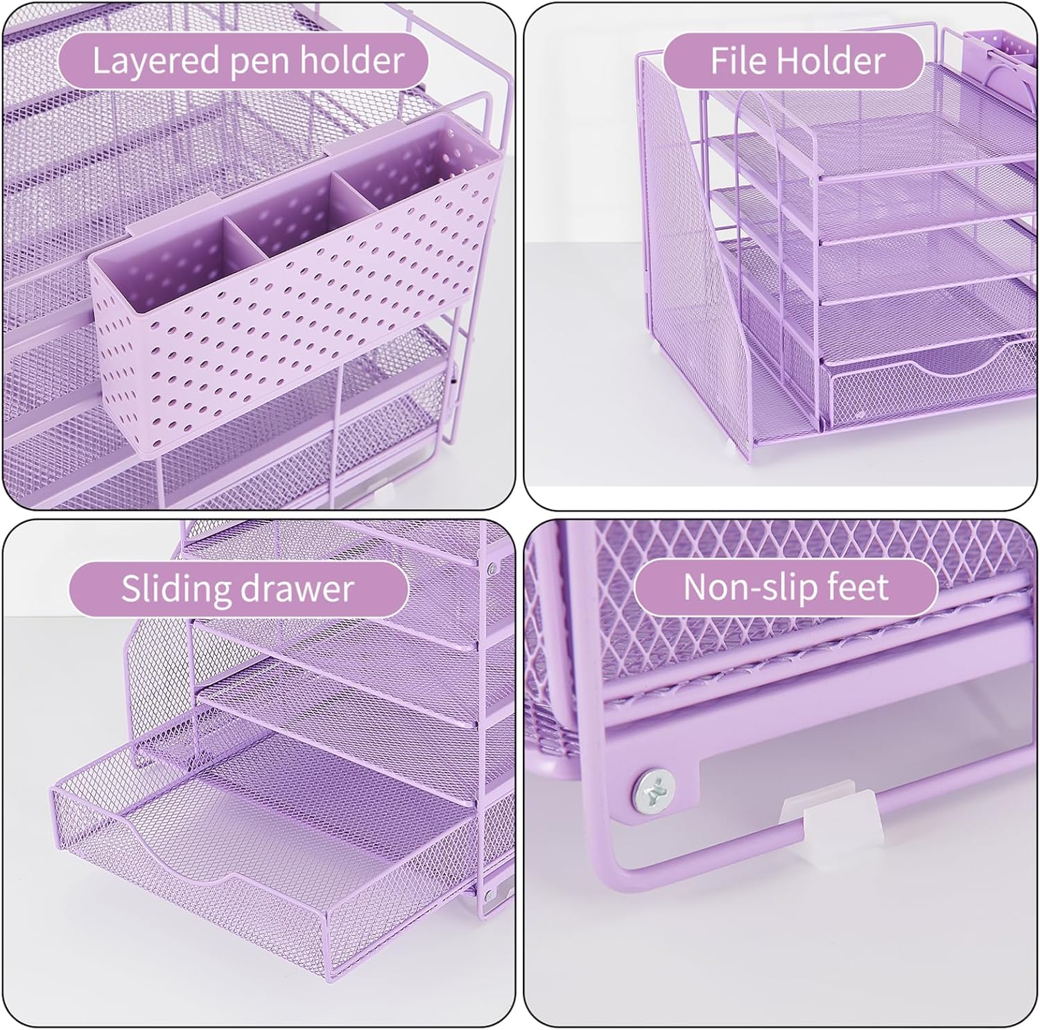 Desk Organizer with Drawer and Pen Holder, 5-Tier Paper Letter Tray Organizer with File Holder, Suitable for Workspace Organizer Office Supplies Storage (Purple)