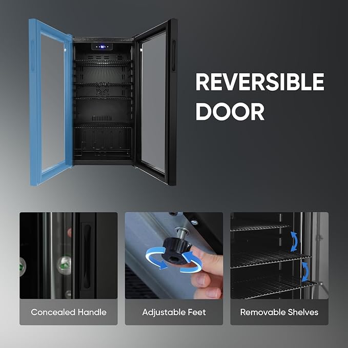 - EFFICIENT INSULATION & FLEXIBLE PLACEMENT - This black beer fridge is insulated with high-density polyurethane insulation, and the mini beverage fridge has a double-design, LOW-E coated glass door that locks in cold air while blocking outside heat and UV rays, ensuring your beverages are kept at the ideal temperature. The reversible door panel and adjustable legs make installation a breeze. It measures 31.29"(H)x17.51"(W)x18.89"(D) for flexible placement. You can place it under a countertop for a stylish built-in look, or place it as a freestanding unit in a game room or bar area