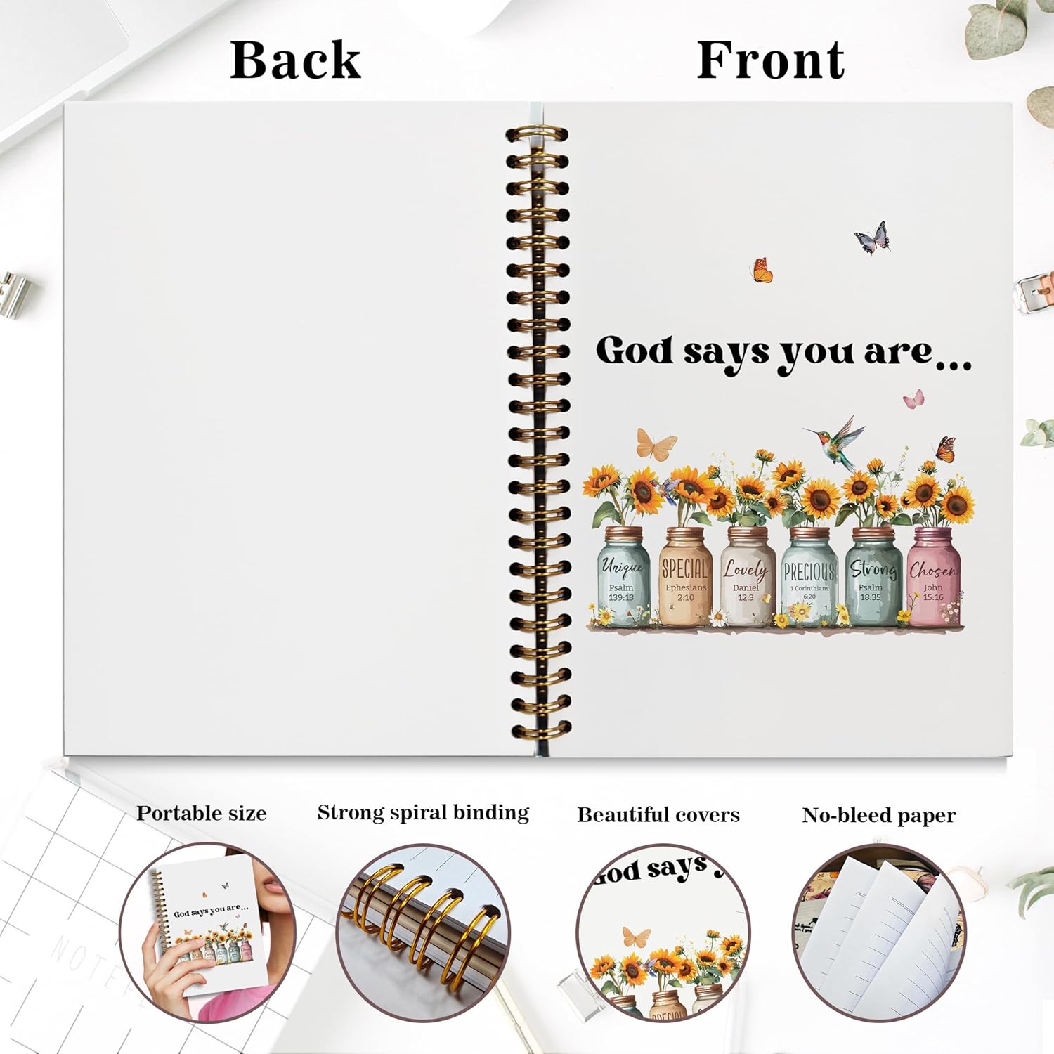 Bible Notebook, A5 Spiral Christian Journal with Sunflower Notebook, Bible Verse-God Says You Are, Inspirational Notebooks for Women, Bible Study, Gift for Birthday Christmas, Office Supplies
