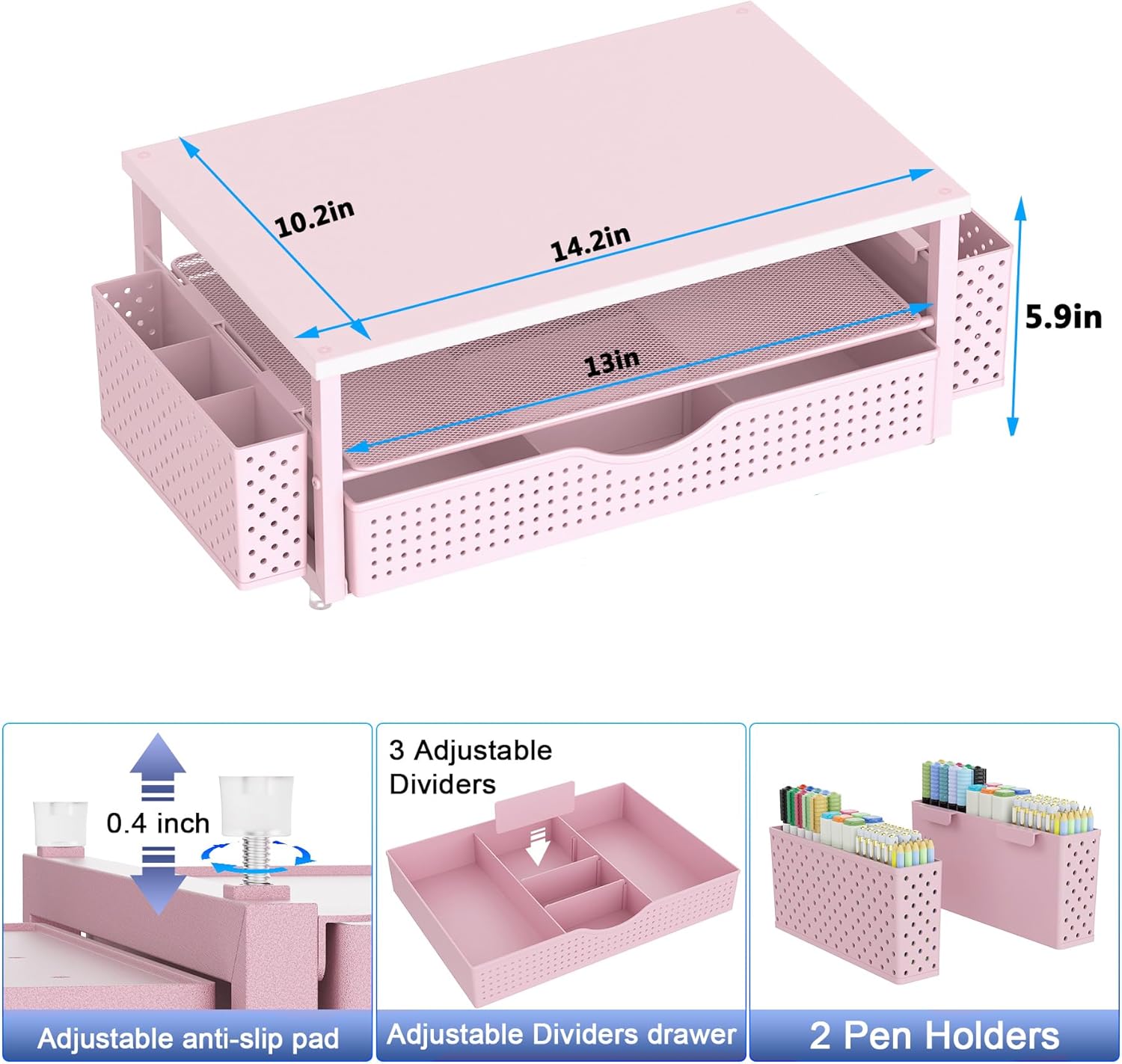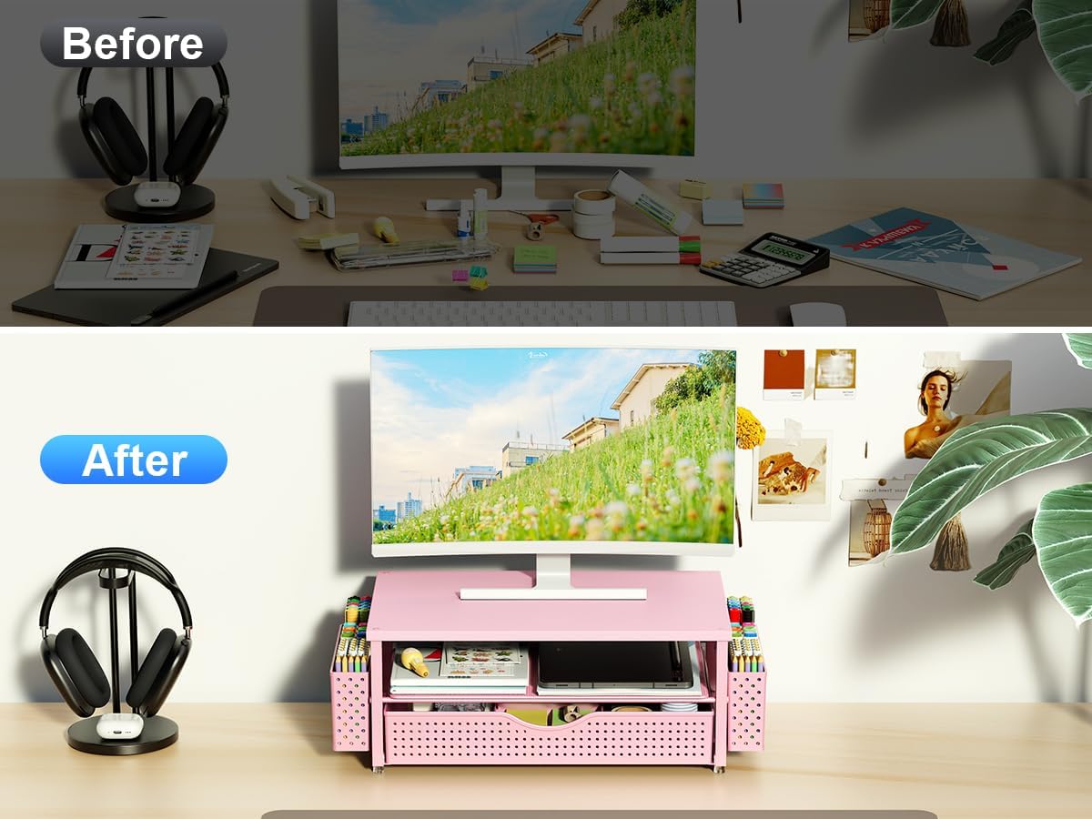 Desk Organizer and Accessories, Computer Monitor Stand Riser with Drawer and 2 Pen Holders, Office Desk Accessories & Workspace Organizers for Office Supplies (Pink)