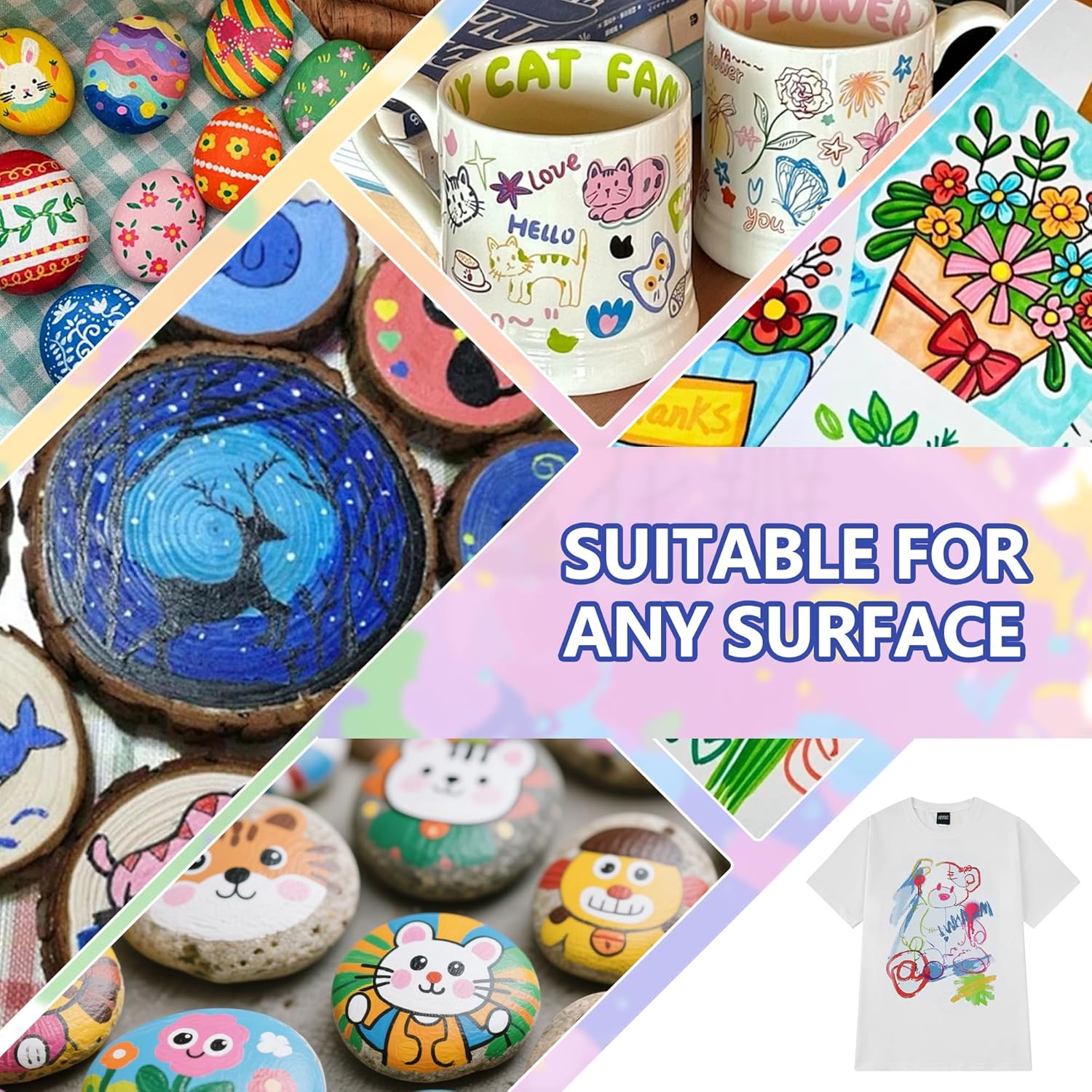 - 🖌️ Works on Virtually Any Surface: Our marker pens are versatile tools that work beautifully on various surfaces, such as paper, rocks, wood, glass, canvas, and more. Whether you're crafting DIY home decor or designing personalized gifts, these markers deliver vibrant, bold colors on every surface, empowering you to unleash your creativity without limits.