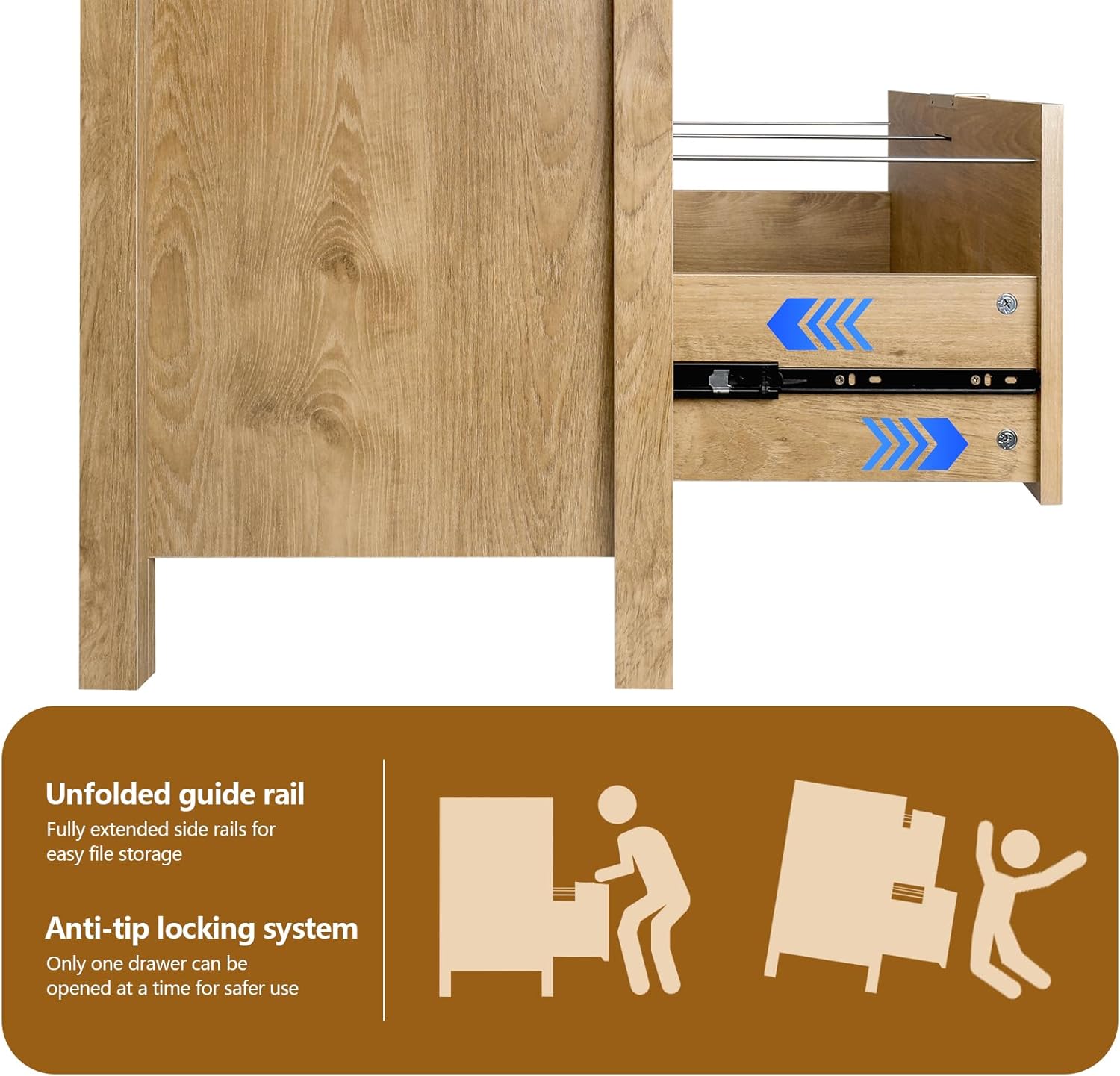 - ăSmooth & Silent Glide SystemăThe wood file cabinet is equipped with high-quality full-extension three-section drawer slides, each drawer opens effortlessly and quietly. No noise, no hassleâjust smooth access to all your folders and files, even those in the very back.