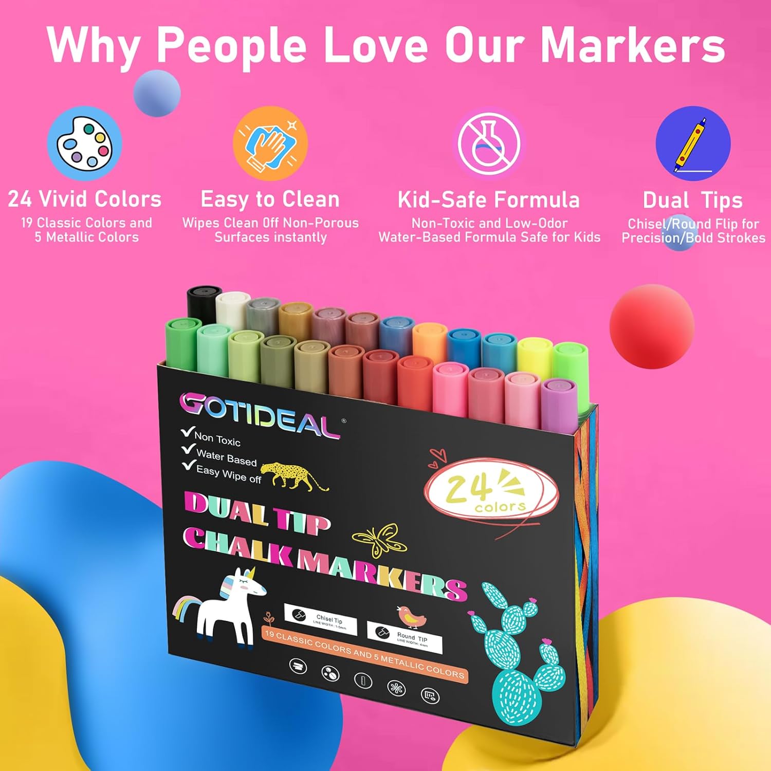 GOTIDEAL Chalk Markers Dual Tips,Erasable Liquid Chalk Marker for Blackboard,Washable Chalk Pens for Auto,Car,Glass,Mirror,Chalkboard,Window markers,24 Colors Chalk Board Markers with Metallic Colors