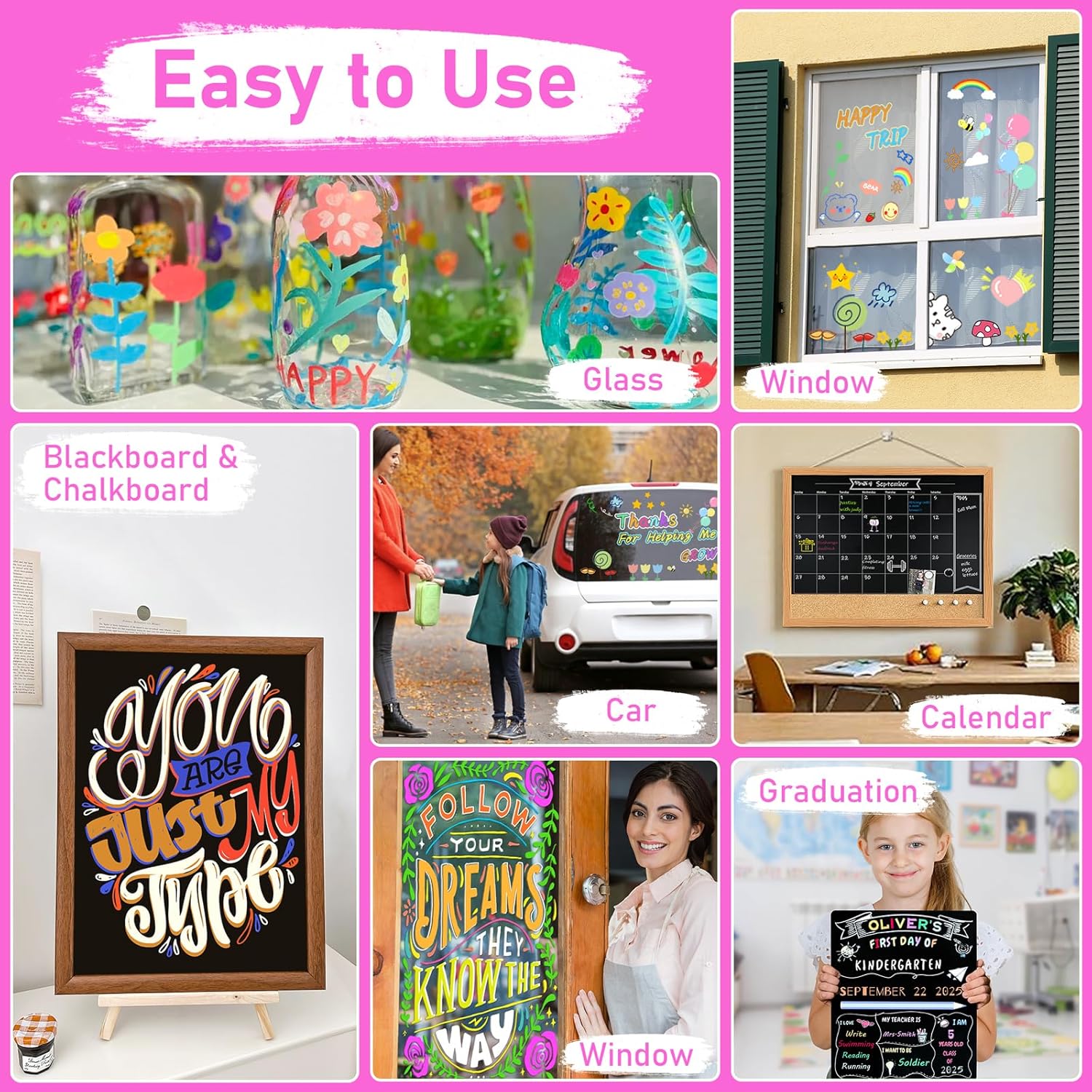 - EASY TO CLEAN:Wet&Dry erase car window markers feature newly upgraded water-based ink for bold,vibrant colors that wipe off easily with dry/wet wipes.Plus,they're washable for quick cleanup.Let your creativity shine and bring your ideas to life with bright,eye-catching colors!