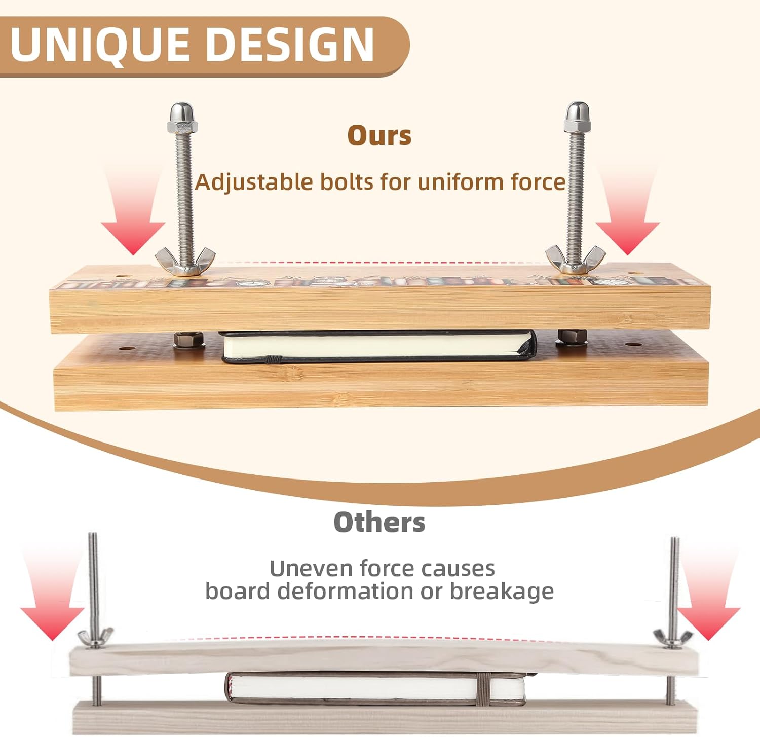 - Eco-Friendly Bamboo Design: Made with sustainable resources, our book press combines environmental responsibility with innovative craftsmanship. Its natural bamboo finish offers an aesthetically pleasing and long-lasting solution for bookbinding enthusiasts.