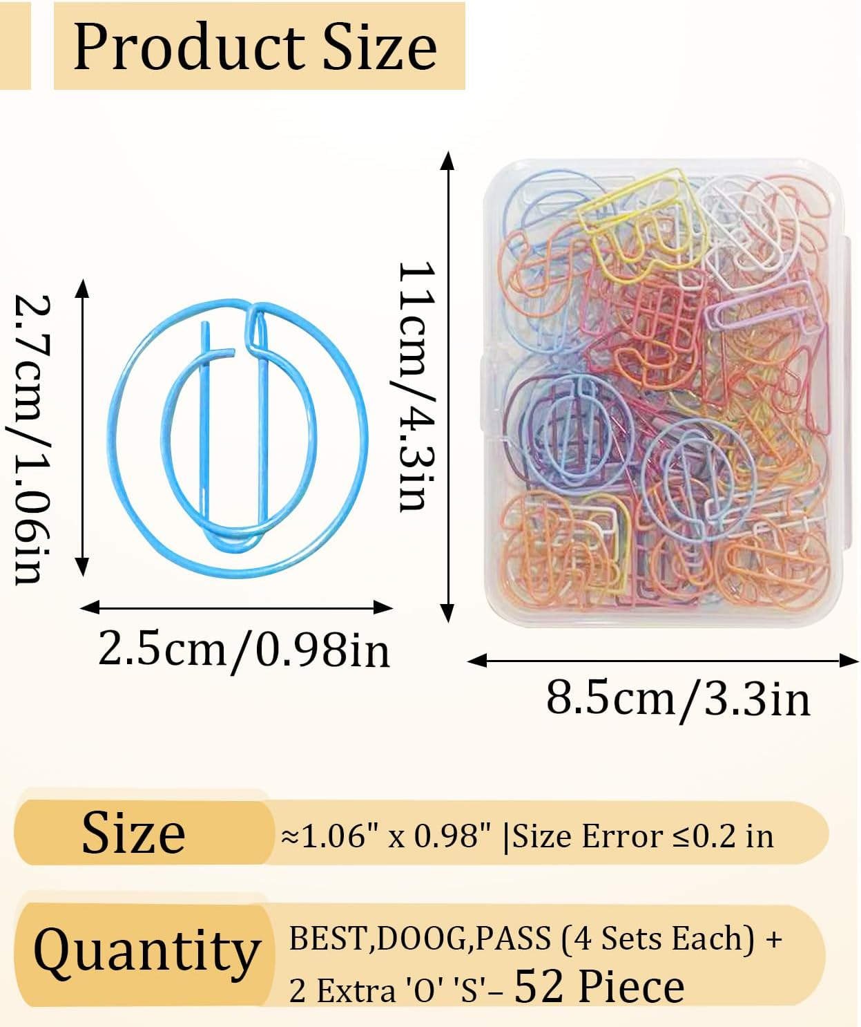 52 Pcs Stainless Steel Paper Clips - Alphabet Letter Clips for Office & School with Storage Box Assorted Color (Teachers' Themes)
