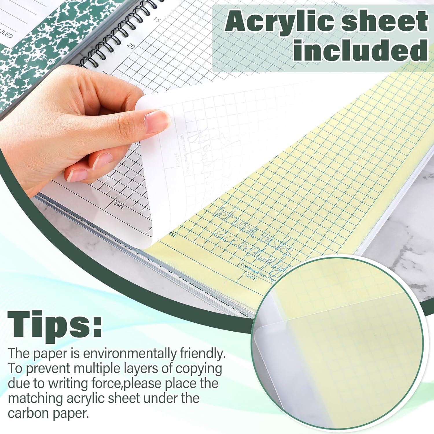 - Warm Tips: each set of gird lab notebook will be given a transparent sheet of acrylic board, Please put it under the carbon paper to prevent heavy writing marks from causing multiple pages to be copied