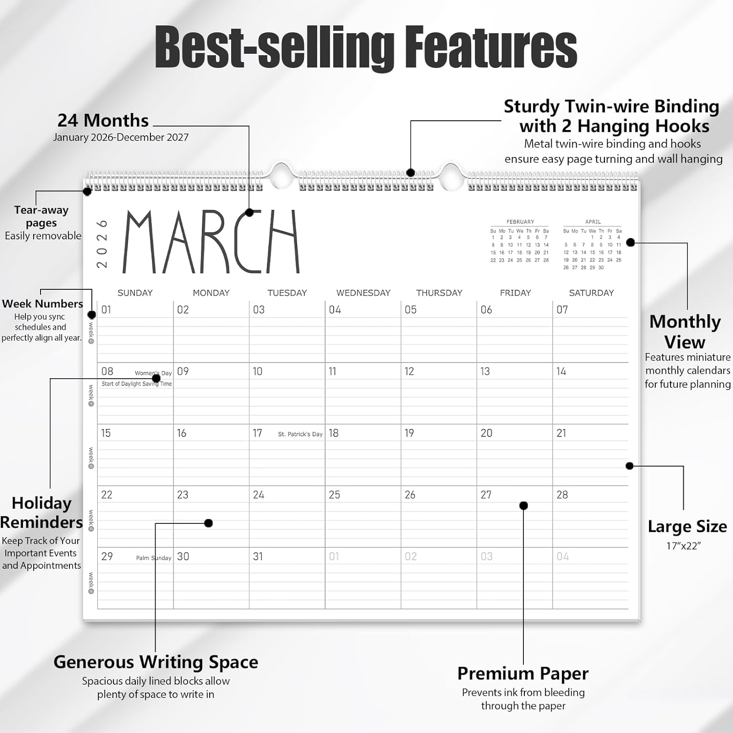 - High-Quality Paper You Can Trust:Crafted with 120 GSM thick paper, this 2026 wall calendar is built to withstand daily planning without ink bleed-through. Enjoy a smooth, satisfying writing experience with pens, highlighters, or pencils. Whether you're color-coding family activities or mapping out academic goals, this 2026-2027 calendar for wall delivers dependable performance on every page