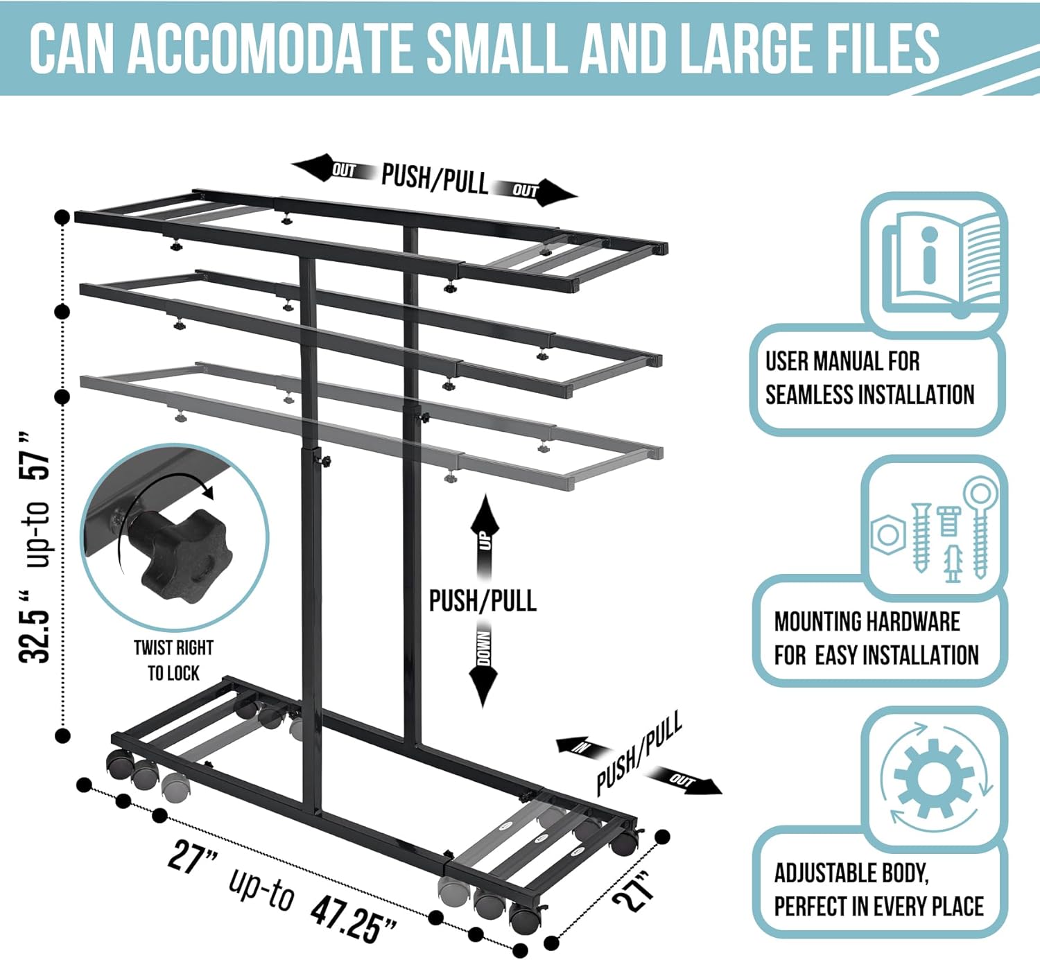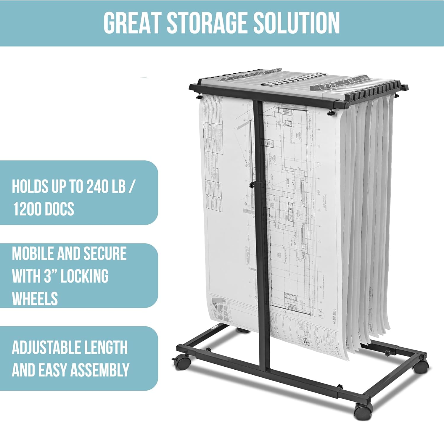 - Mobile and Adjustable Rack: The blueprint rack rolls smoothly on four casters, with front brakes for stability. Height and depth adjustments accommodate different file sizes, making it versatile for various office or job site needs.