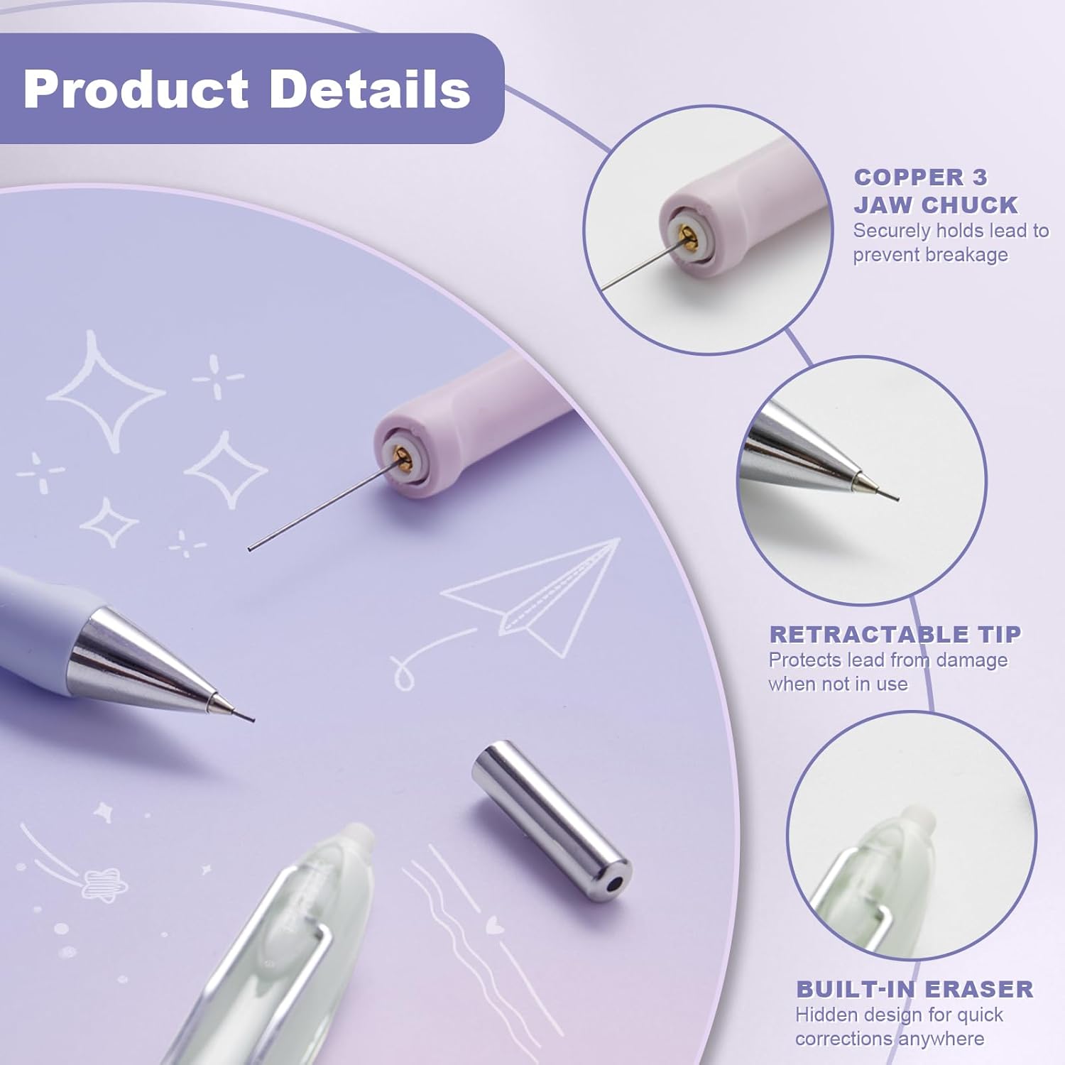 - đ ăCopper 3-Jaw Chuck â Durable & Break-Resistantă Securely holds the lead in place to minimize breakage. Built with premium copper, it's more stable and long-lasting than plastic alternatives.