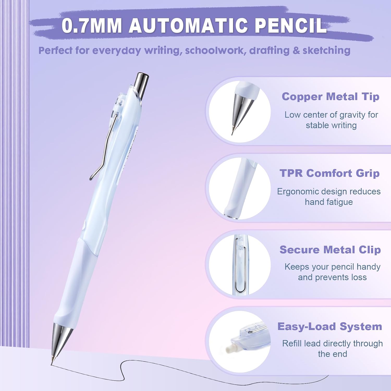 - đ ăEasy-Load Design & Metal Clipă Quickly reload lead through the back end. A strong metal clip keeps your pencil attached to notebooks, pockets, or clipboards at all times.
