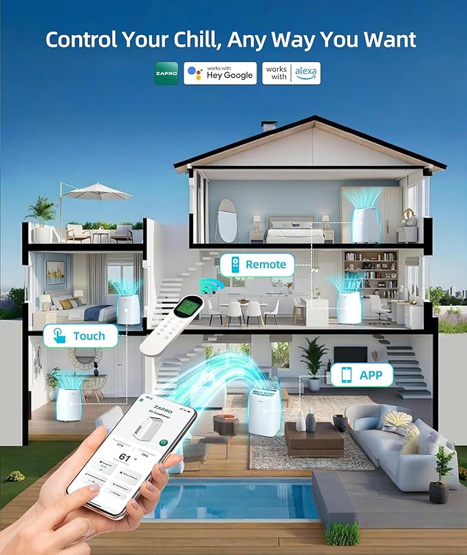ZAFRO 12000 BTU Portable Air Conditioners (8000 BTU SACC), AC Unit for Bedroom with Drainage-free Cooling, Fan & Dehumidifier, 47dB Quiet, 24H Timer, APP Control/Remote/LED Display