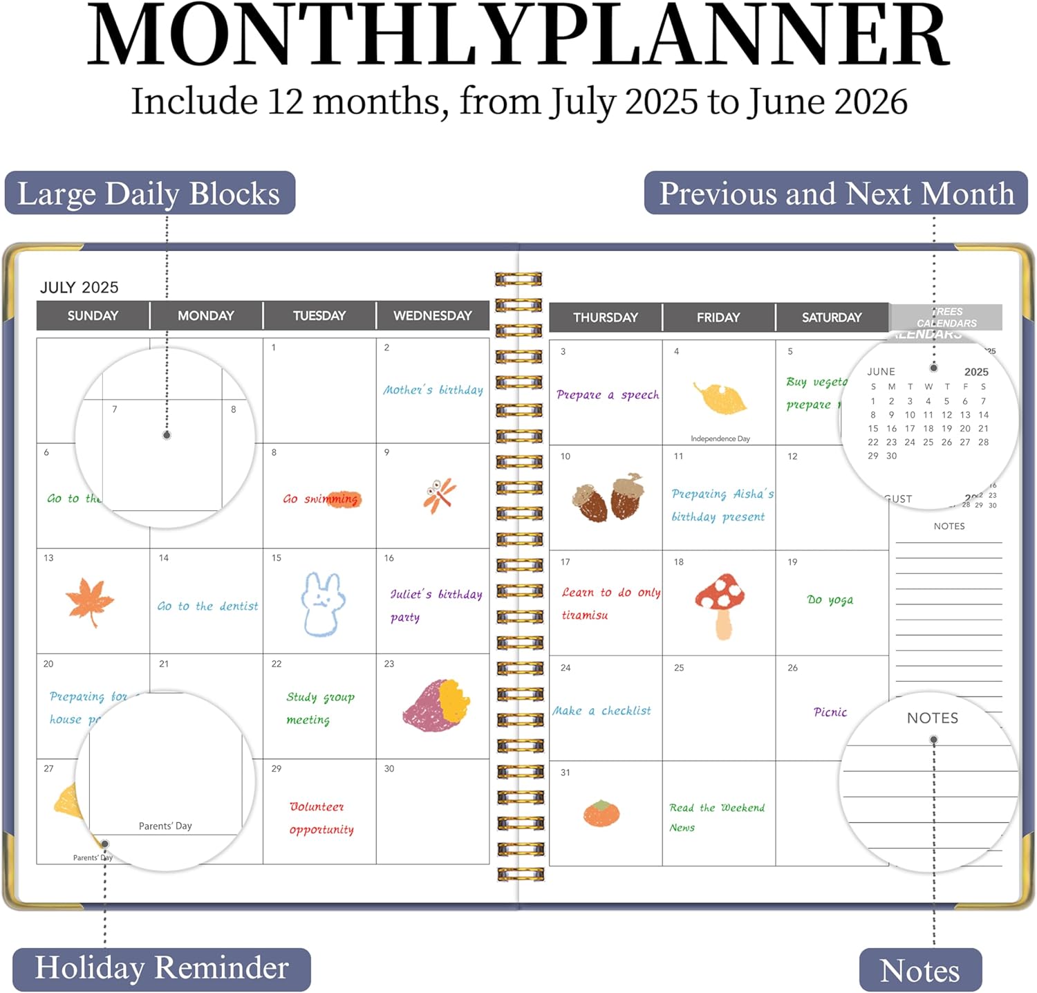 - Monthly View - The Appointment Book&Planner spans 12 months, from July 2025 to June 2026. Each date box offers plenty of space for writing, featuring references to both the previous and upcoming months. The planner includes regular daily blocks that mark popular holidays and Julian dates, facilitating the scheduling of long-term projects and appointments.