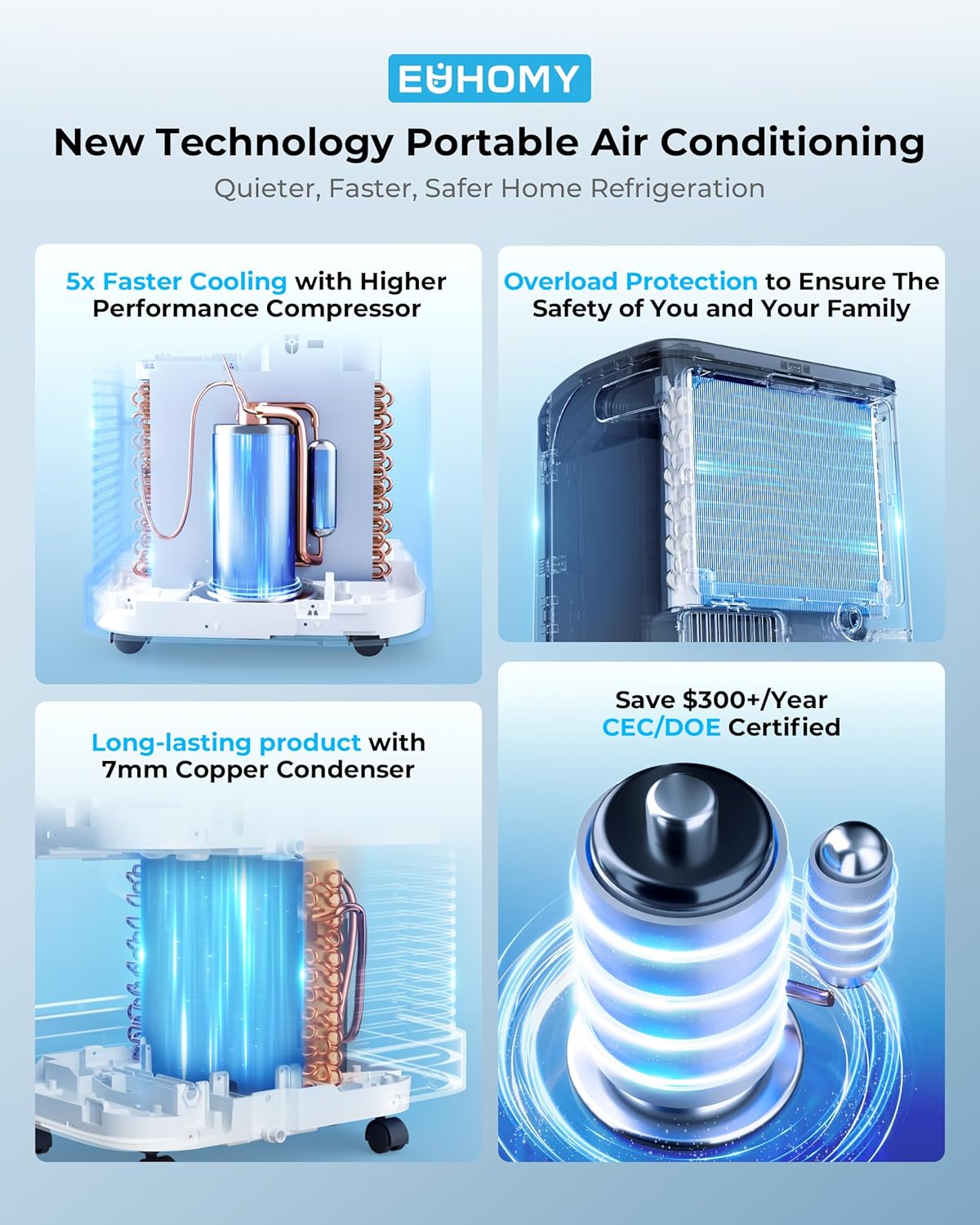 - âď¸ăEnergy-Saving Powerhouse with Lightning Coolingă Stop sweating bills AND heat! The EUHOMY portable air conditioner delivers exceptional energy efficiency (CEER 7.8), slashing summer costs while cooling your space incredibly fast â in just 60 s. Effortlessly chill large areas up to 700 Sq.ft, making it the ultimate room air conditioner for apartments, bedrooms, offices, kitchens, or living rooms. Experience powerful comfort without the ice or water added.