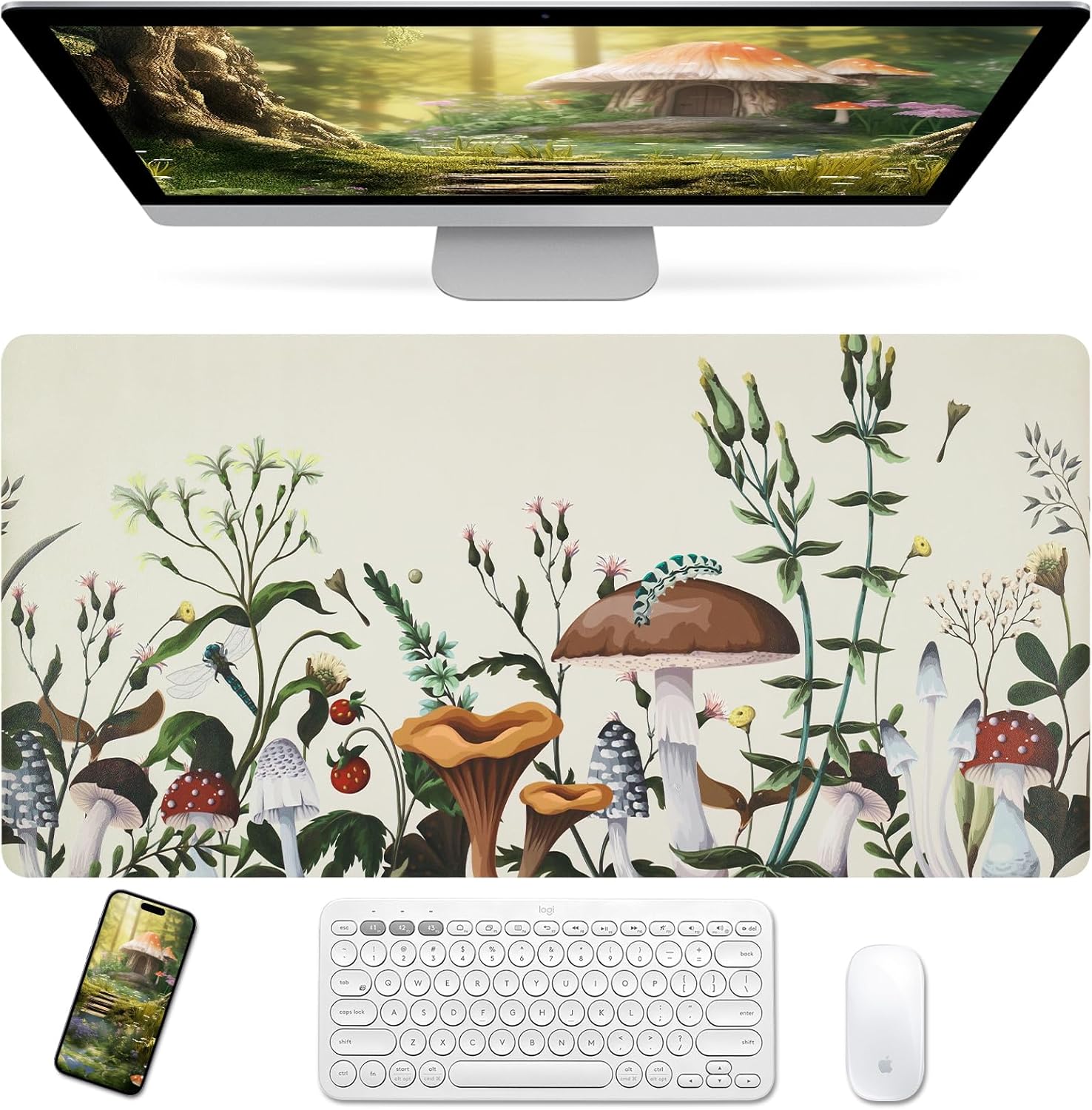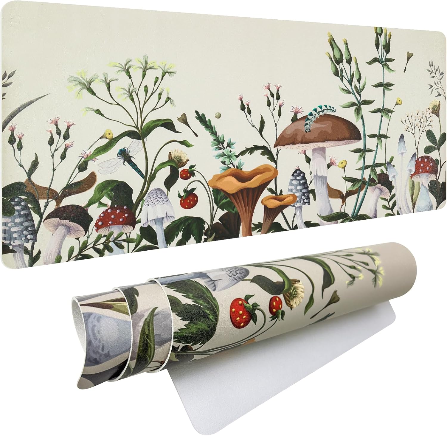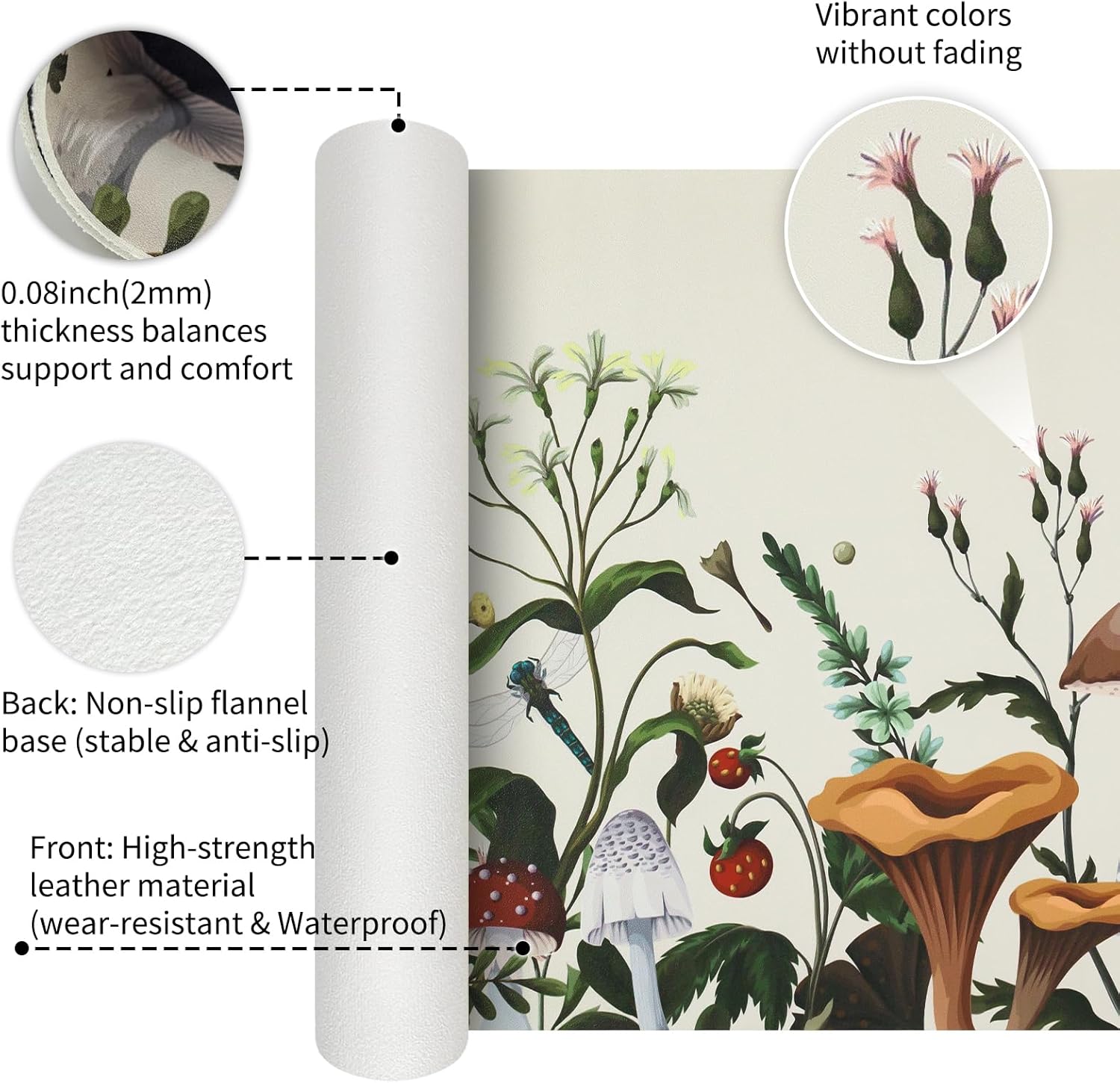 Bloss Plant Mushroom Desks Pad,Large Mouse Pad for Desktop, Leather Floral Desk Mat for Keyboard and Mouse,Waterproof Computer Laptop Desk Protector Mat for Office/Home/Women Gift,White 31.5" x 15.7"