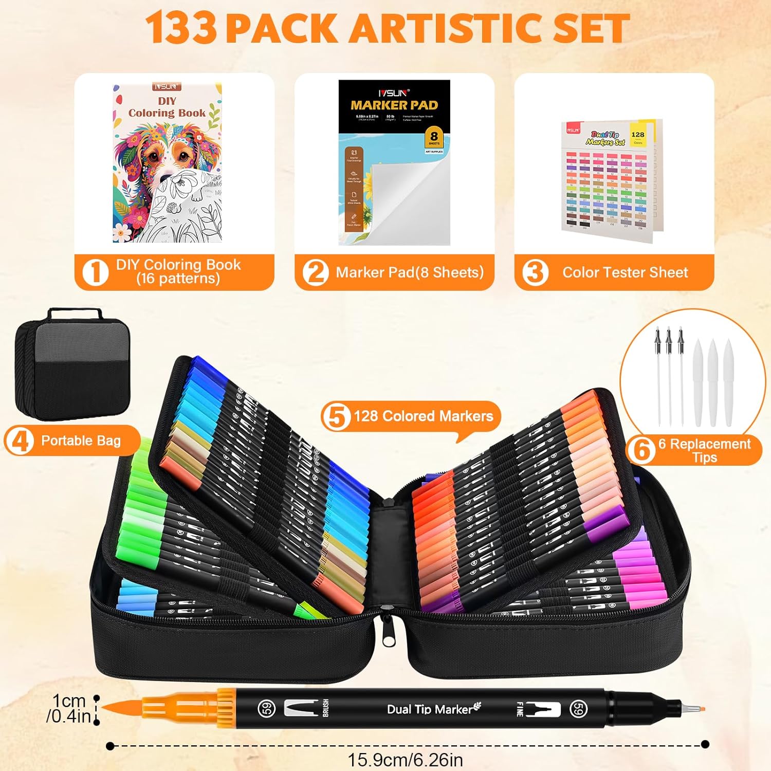 - WELL PACKED & PORTABLE CASE: Own and take it when traveling! These art markers are well packed in a sturdy and durable zipper case for better storage and organizationin, color selection, truly an great ideal for coloring books for adults relaxation. Include 1 x Portable Case, 128 x Dual Tip Marker Pens, 1 x DIY Coloring Book, 1 x Marker Pad, 6 x Replaceable Nibs, 1 x Color Card.