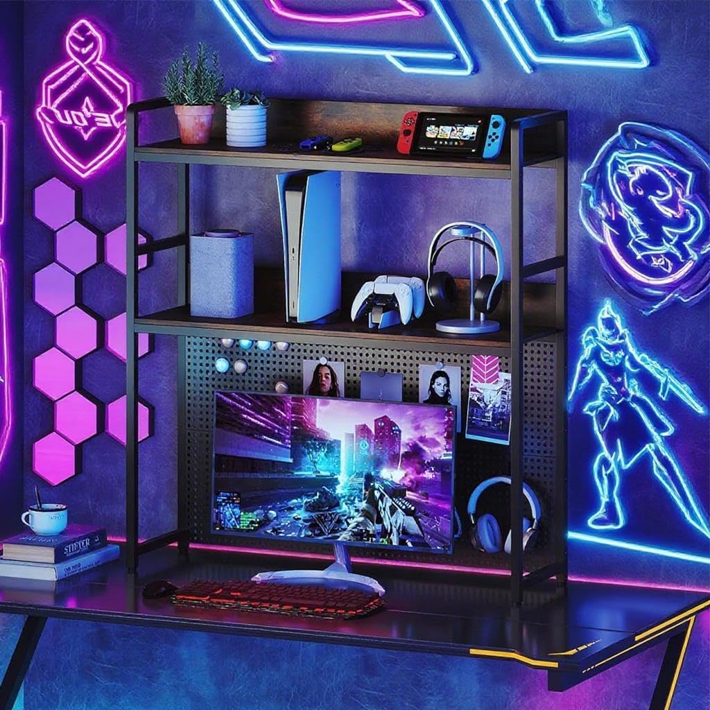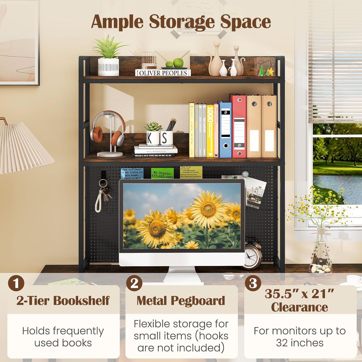 - Monitor Storage & Pegboard: The desktop bookcase offers a 35.5"L x 21"W bottom clearance, perfectly accommodating monitors up to 32 inches. More, its pegboard (hooks not included) is perfect for holding tools, stationery, or other small items.