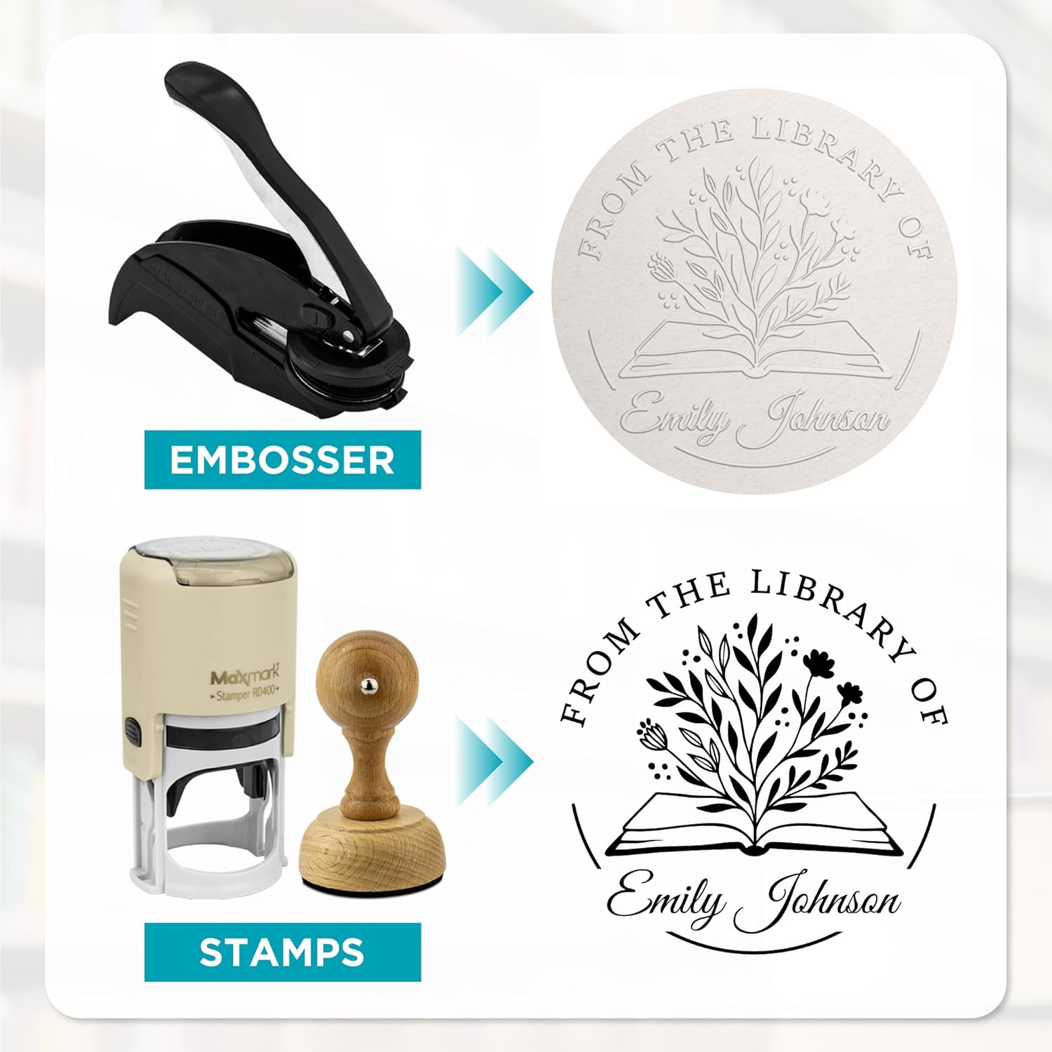 Custom Library Embosser - Style 116 - Embosser, Wood Stamp or Self Inking Stamp - Book Embosser Includes 50 Gold Seals - Custom Stamp Seal from The Library of