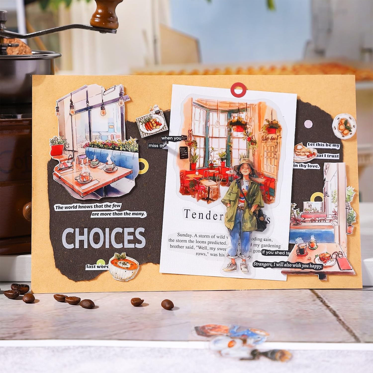 Coffee Memories PET Stickers, 120 PCS Vintage Cafe Scene Stickers for Scrapbook, Journals, Planners and DIY Craft Decoration
