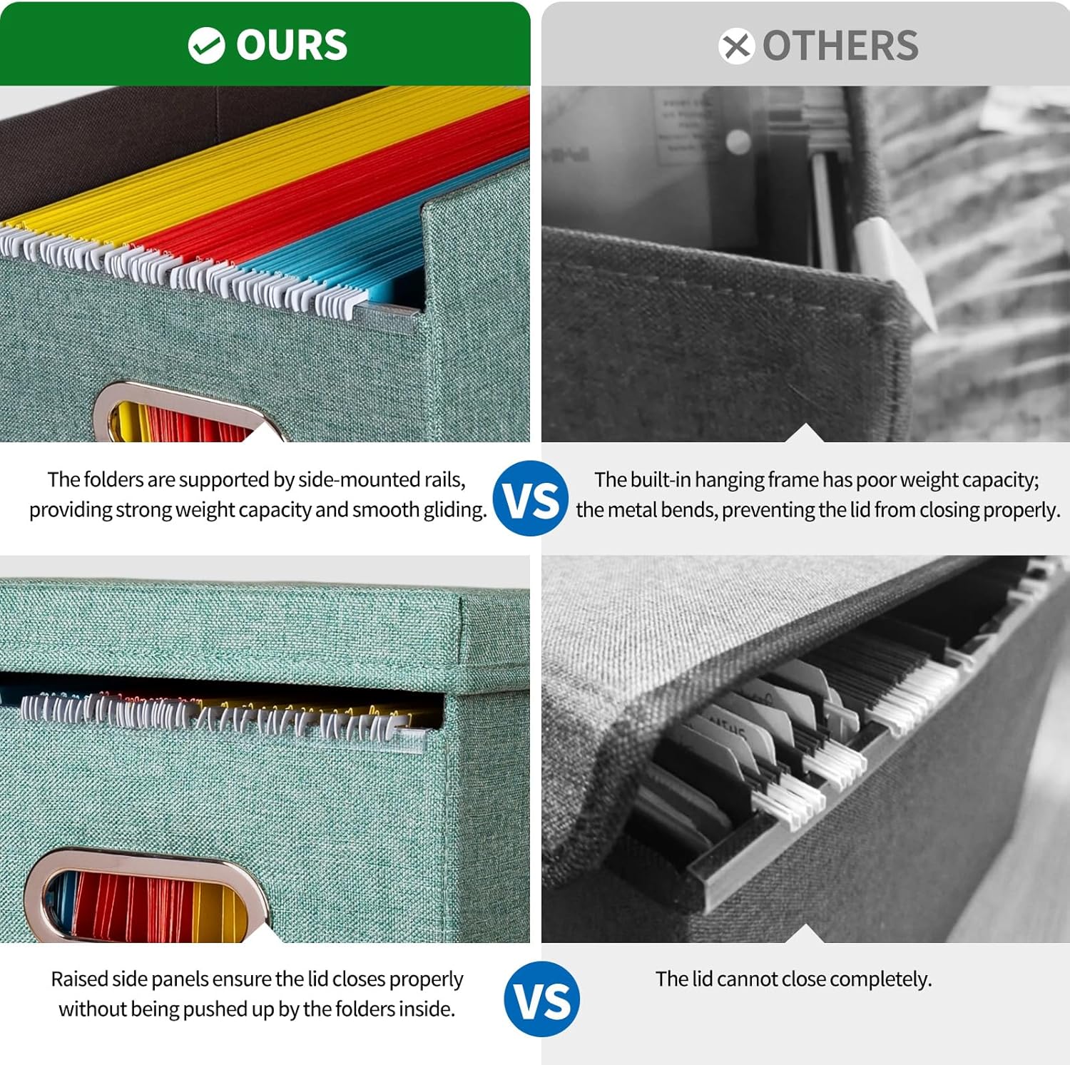 - Exclusive Lid-Friendly Design: Unlike standard file boxes, our unique raised-side design prevents file tabs from bending when the lid is closed. Features smooth PVC rails on front and back for effortless sliding, perfect for hanging file folders without damaging tabs