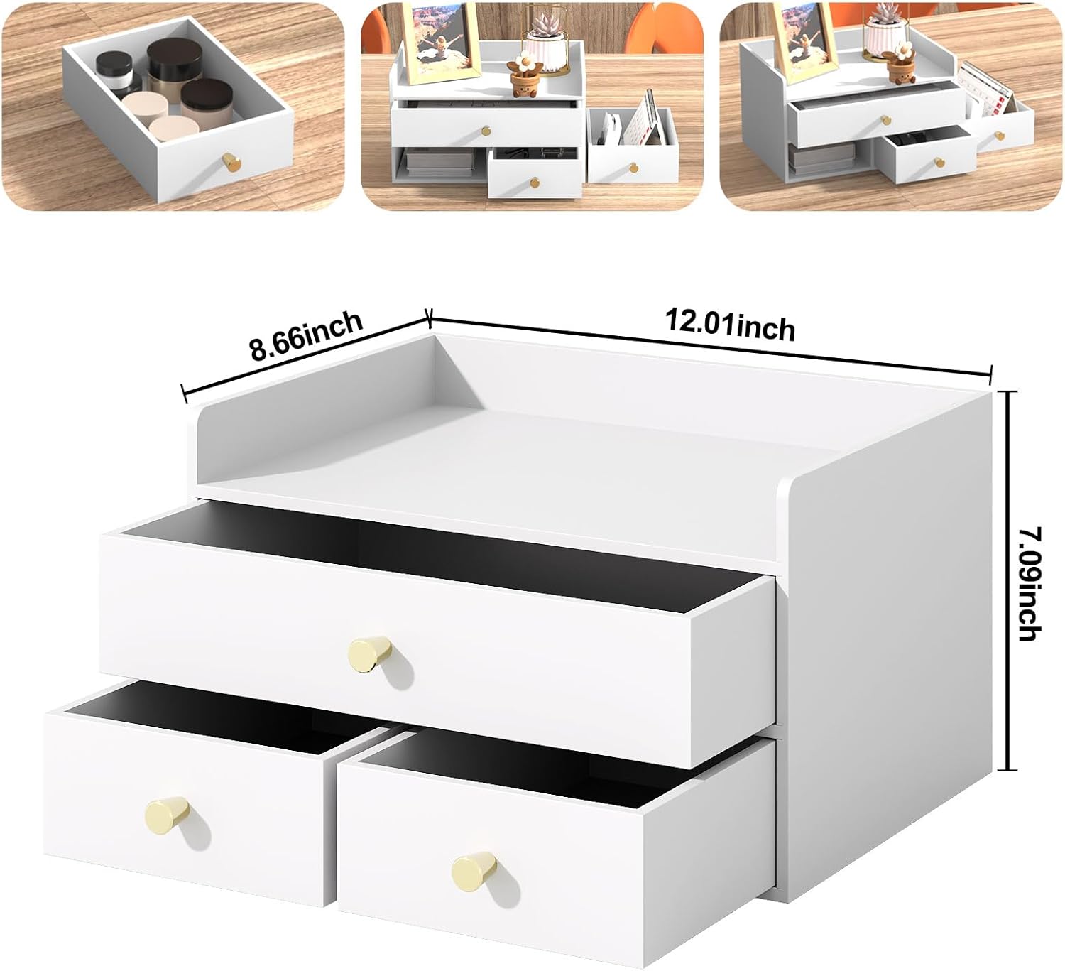 - Ample Storage Capacity: With multiple size drawers, the desktop storage efficiently organizes office supplies, cosmetics, accessories, and daily essentials. Dimensions: 12.2" x 8.58" x 7.09" – compact yet versatile for various spaces.