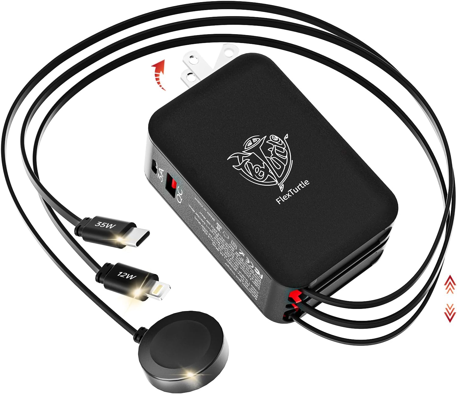 - ăSpace-Saving Retractable Design ă-The FlexTurtle retractable phone charger wall plug features three 3.2ft retractable cables (USB-C, Lightning, and Apple Watch), eliminating clutter. Perfect as a phone charging station for desks, nightstands, or as travel accessories for women and men
