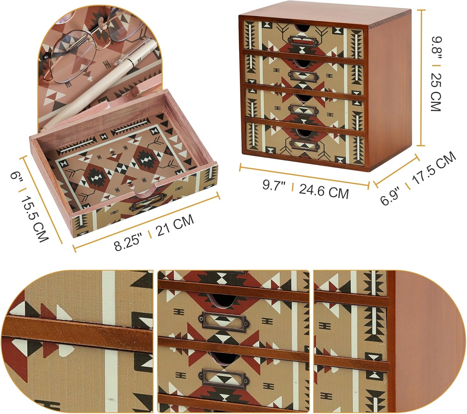 Boho Navajo Wooden Desk Organizer with Drawers – 4-Drawer Desktop Storage Box – Rustic Tribal Wood Desk Organizer for Office, Vanity, or Craft Supplies – Compact & Stylish Wooden Storage Drawers