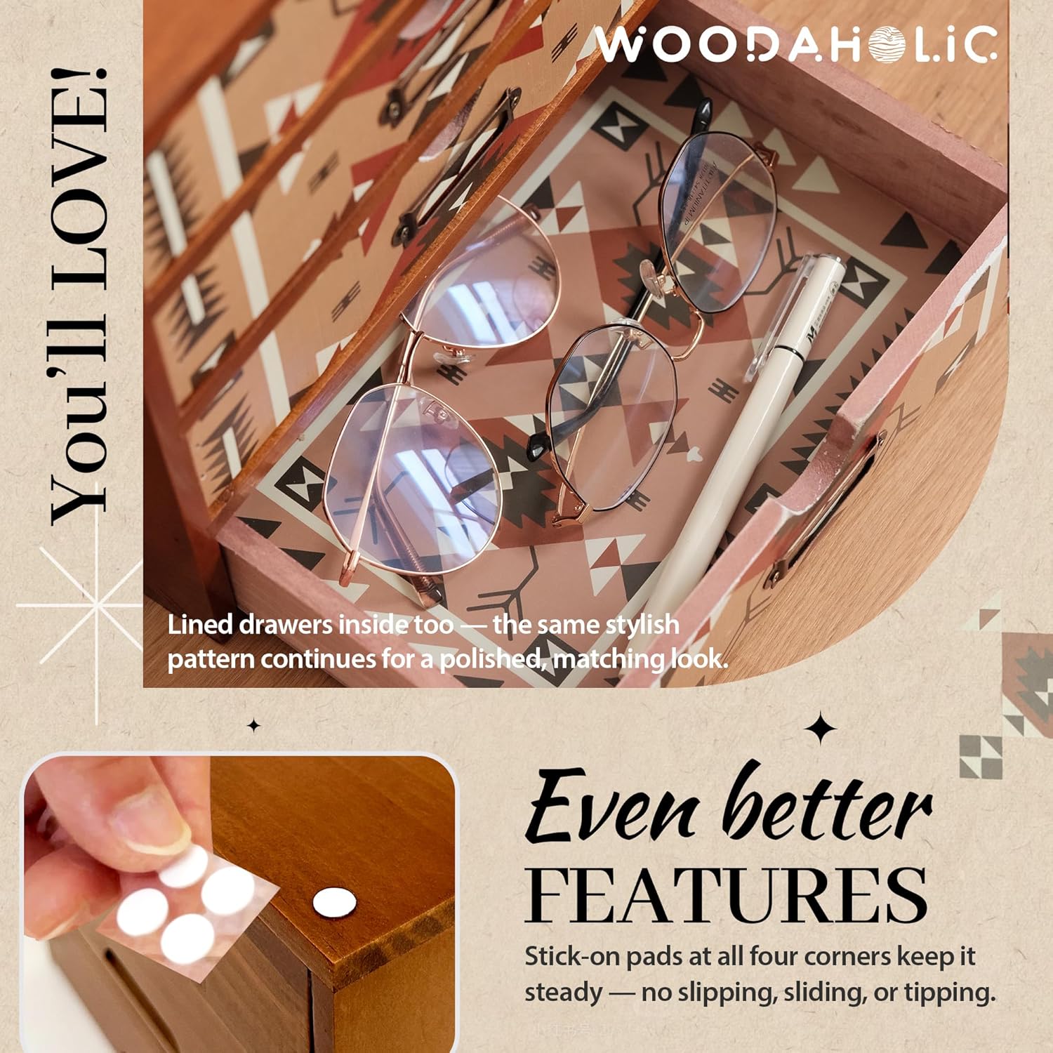 - Premium wood craftsmanship: Made of durable, high-quality solid wood with a natural finish and beautiful coordinated lining inside each drawer for a cohesive, polished look — a sturdy and stylish wooden drawer organizer.