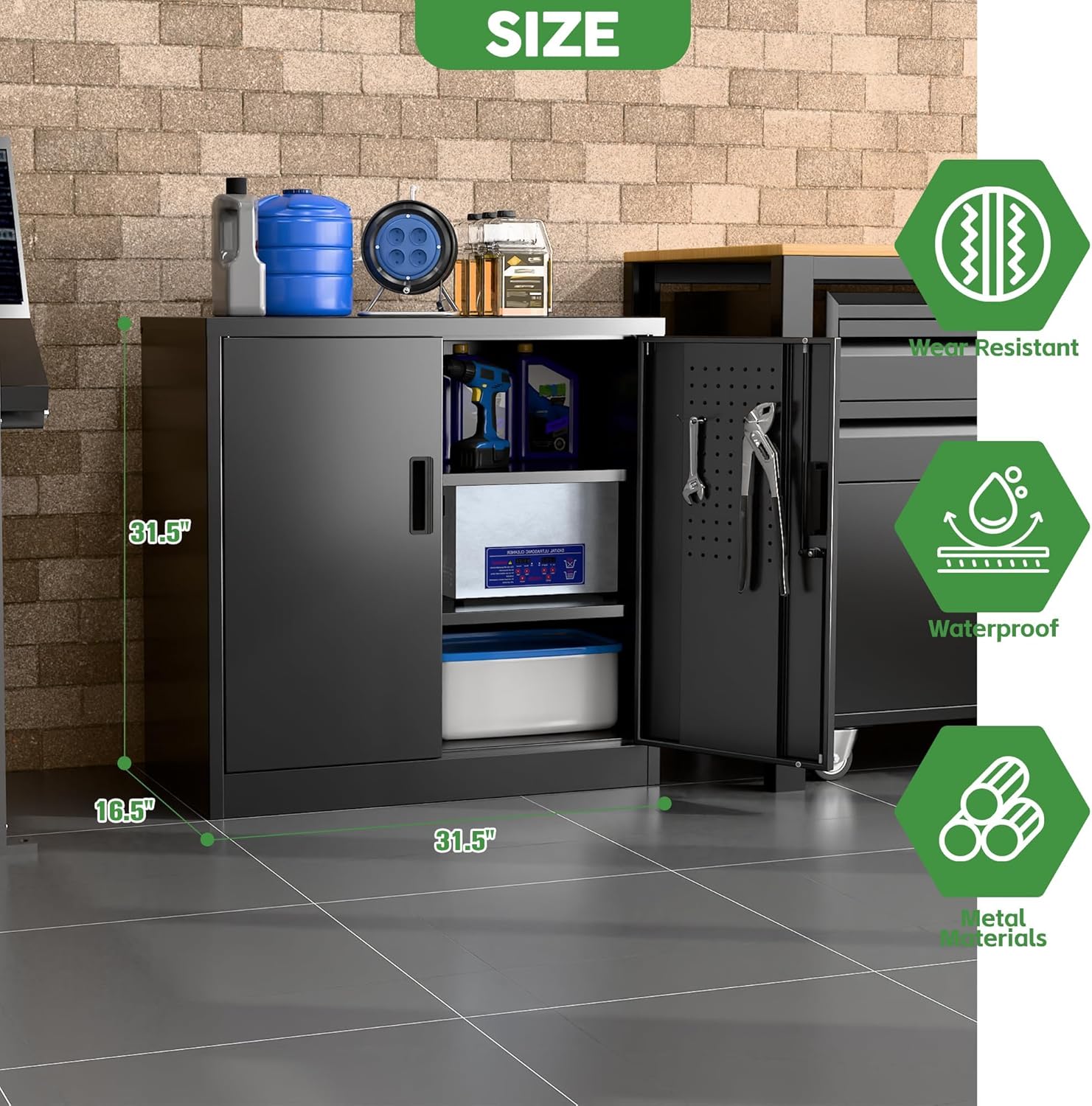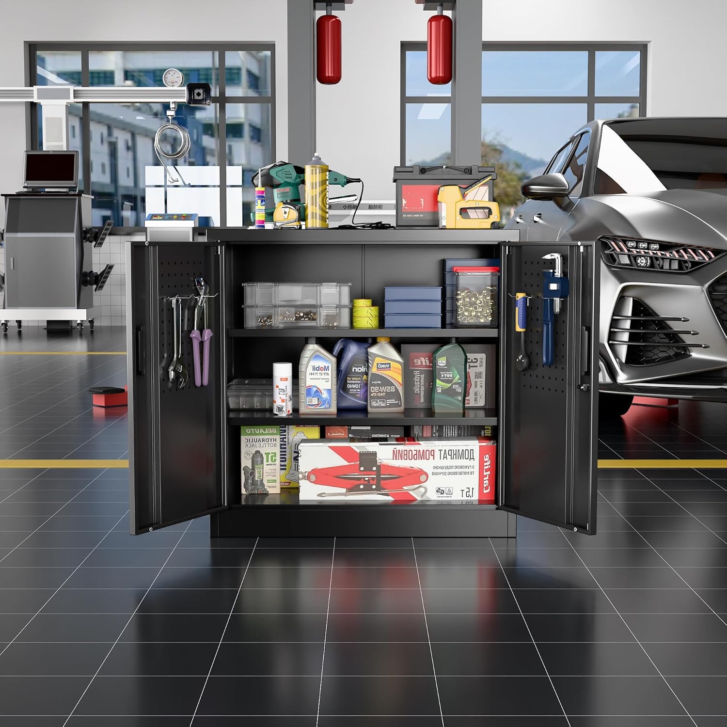 Aobabo 31.5" H Small Garage Storage Cabinet with Pegboard,Lockable File Storage Cabinet with 2 Adjustable Shelves for Garage, Office, School, Assembly Require, Black