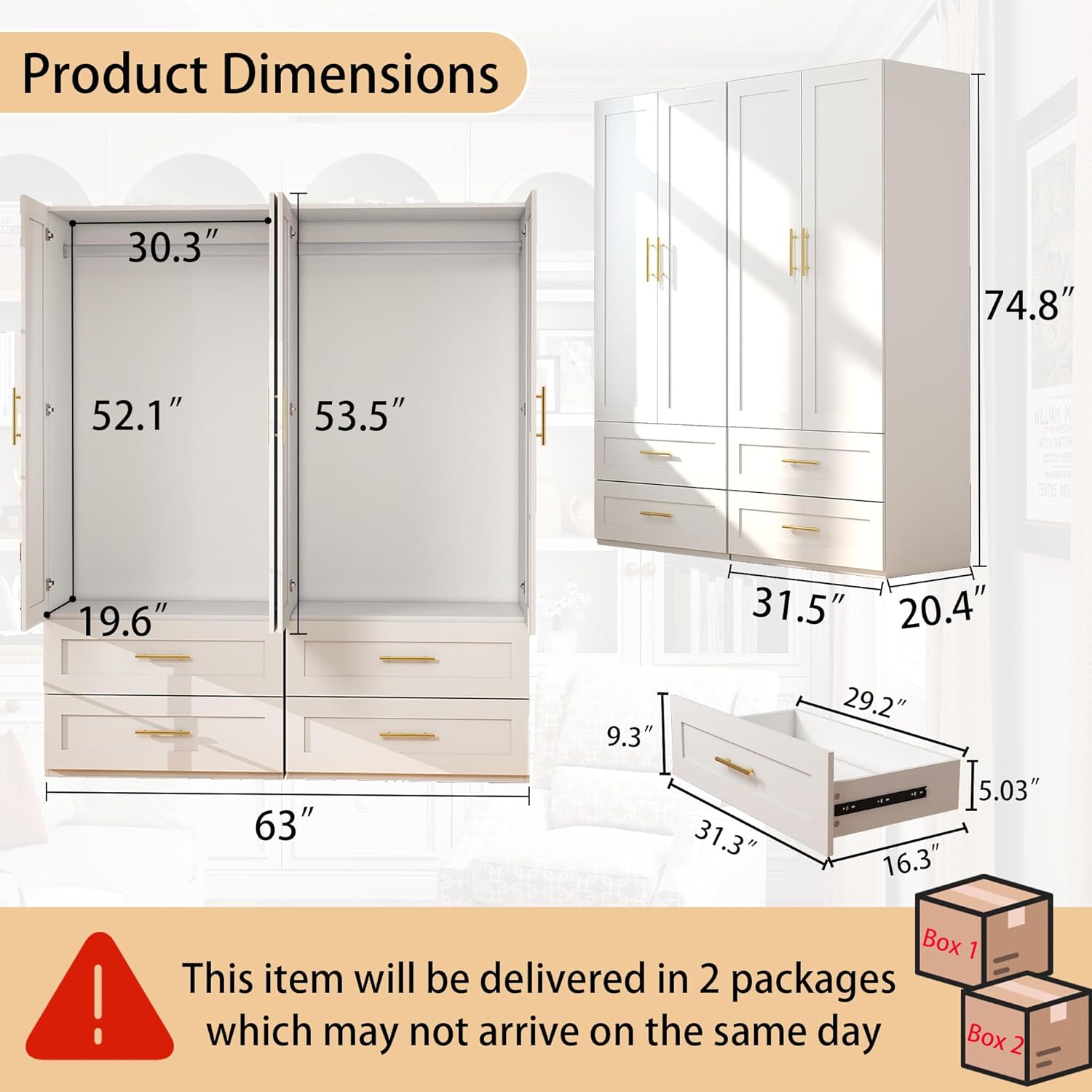 White Wardrobe with 4 Doors: 75" Tall Armoire Wardrobe Closet with 4 Drawers, Bedroom Closet Cabinet for Hanging Clothes, Wooden Storage Armoire with Shelves (Contemporary, 2)