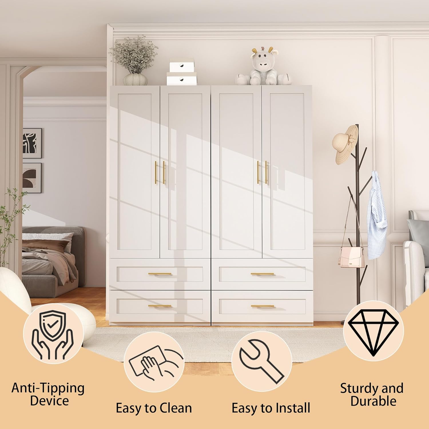 - Premium Materials: Crafted from high-quality engineered wood, the wardrobe with drawers and shelves offers lasting durability. The surface of the white closet with doors is specially treated to resist wear and scratches while being easy to clean, ensuring it stays looking great even with everyday use. For added safety and stability, the free standing closet with doors includes an anti-tip device—making it especially suitable for homes with children or pets.