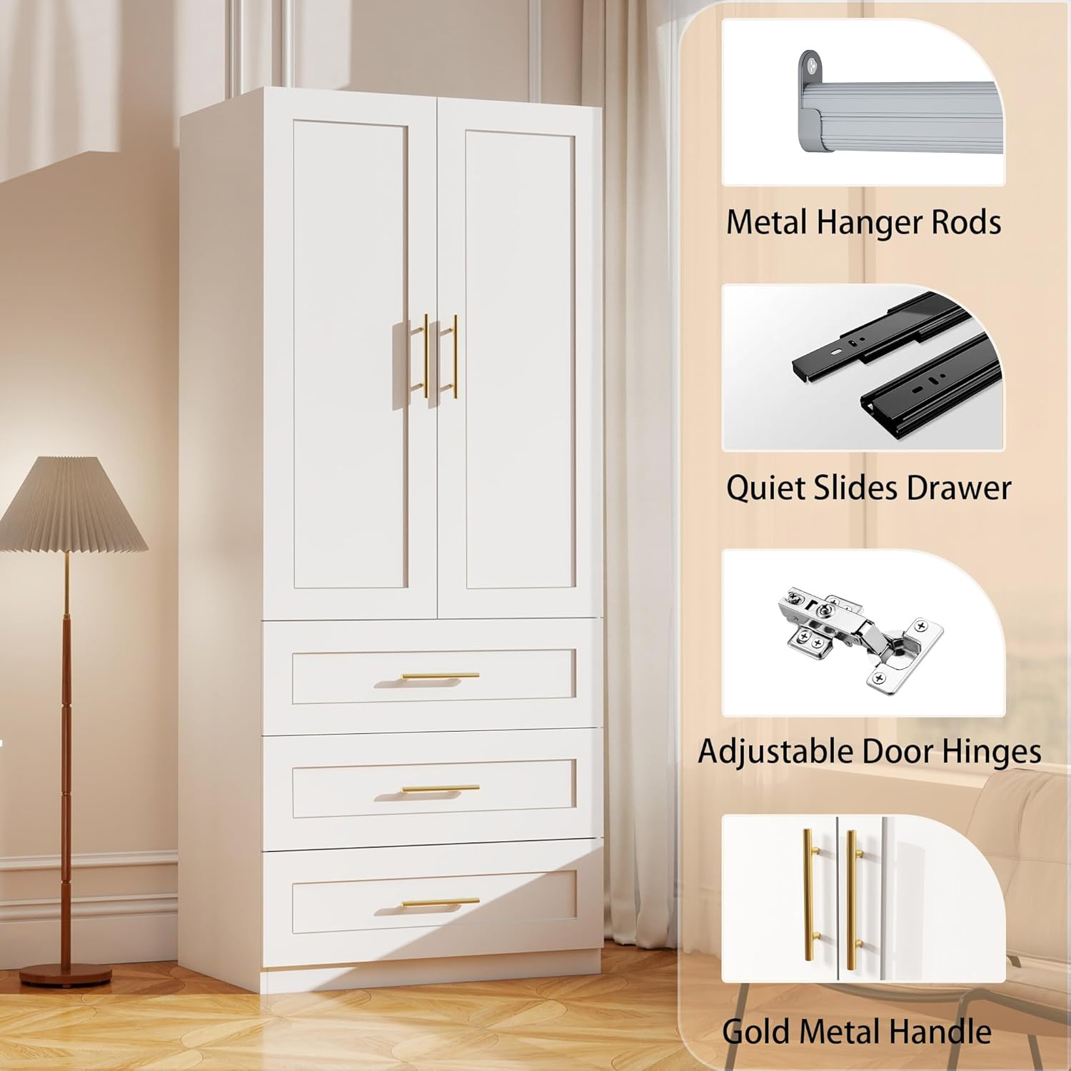 - Sturdy and User Structure: The clothing armoire with drawers features not only a well-organized interior layout but also a top surface that serves as extra storage—perfect for suitcasesor rarely used items, helping you make the most of vertical space. The drawers of the armoires and wardrobes are equipped with metal slide rails for smooth, quiet operation. The wardrobe armoire closet with drawers includes adjustable soft-close door hinges, ensuring silent use even during late-night hours.