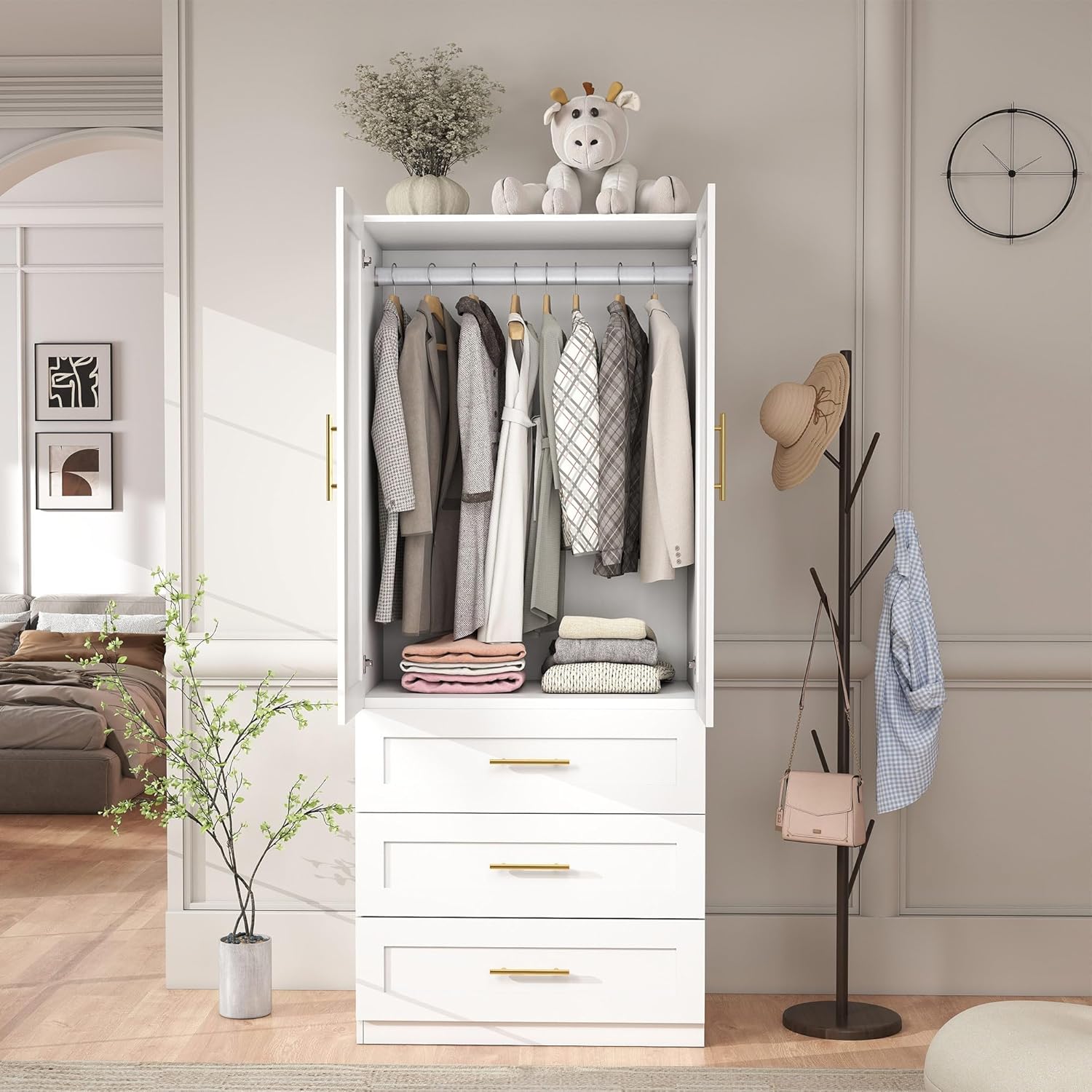 - Premium Materials: Crafted from high-quality engineered wood, the wardrobe with drawers and shelves offers lasting durability. The surface of the white closet with doors is specially treated to resist wear and scratches while being easy to clean, ensuring it stays looking great even with everyday use. For added safety and stability, the free standing closet with doors includes an anti-tip device—making it especially suitable for homes with children or pets.