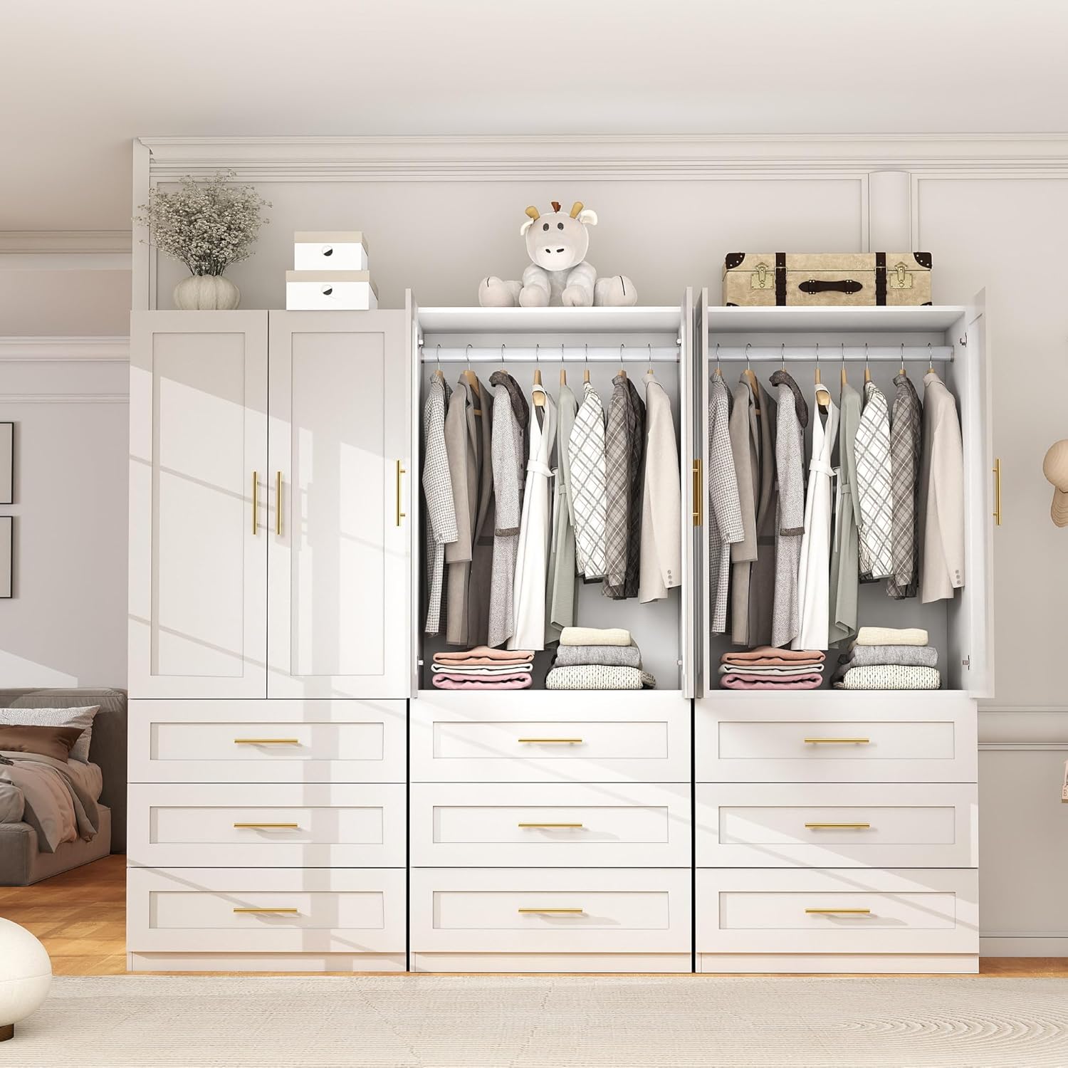 - Versatile Storage Space:The closet cabinets with doors and shelves features a thoughtfully designed upper-lower partition structure. The closet wardrobe with drawers includes a dedicated hanging area that easily accommodates long coats or dresses. Additionally, the bedroom closet cabinet comes equipped with spacious drawers to organize everyday clothing, bedding, or personal items—perfect for meeting the storage needs of different family members.
