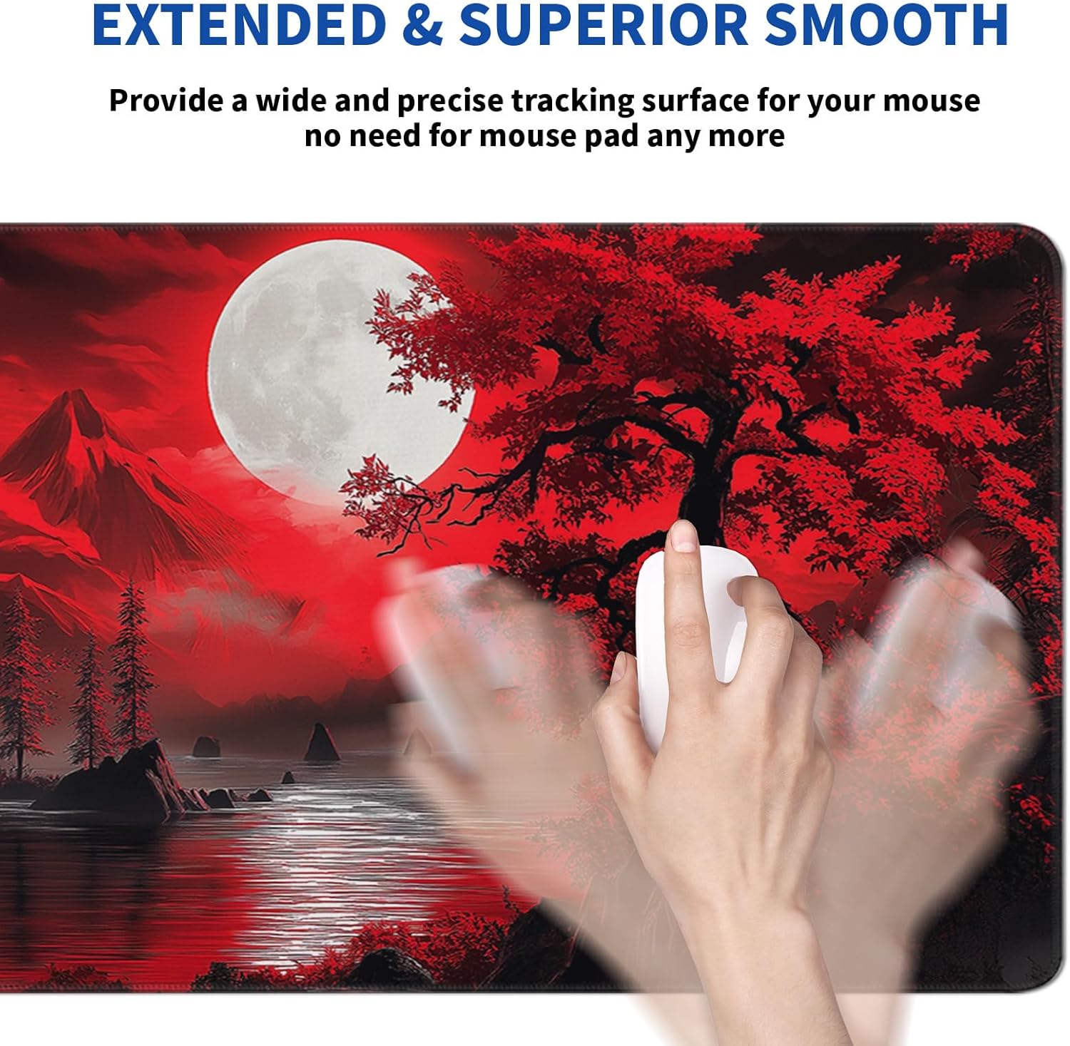 - ♥[Large and Perfect Size]:The extended Darkness Red Moon desk pad measures 31.5x11.8x0.12 inches that covers most of the desk.The desk pad is large enough to have a mouse, gaming keyboard, and other desk items while maintaining protecting your desk all the time.You can freely move your mouse without any interruption and don't have to continually adjust the mat as you do with traditional mousepads.