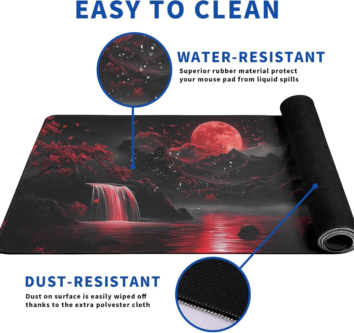 - ♥[Easy To Clean]:This large Darkness Red Moon mouse pad for desk, Spill-proof coating protects your desktop from spilled water, Drinks, Ink and the other liquid spilled liquid or other accidents.Easy to clean, Just wipe with a wet cloth or paper, Does not fade and can be washed and foldable without leaving creases, Easy to carry.
